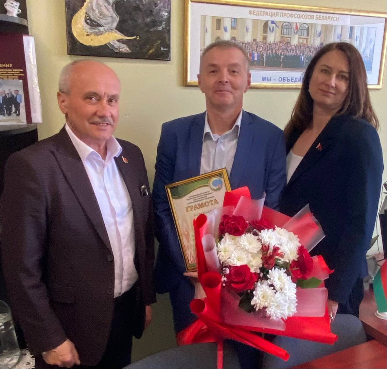 Приятным дополнением к теплым поздравлениям по случаю праздника стала Грамота Республиканского комитета отраслевого профсоюза, которую Ромуальд Юровский вручил юбиляру.