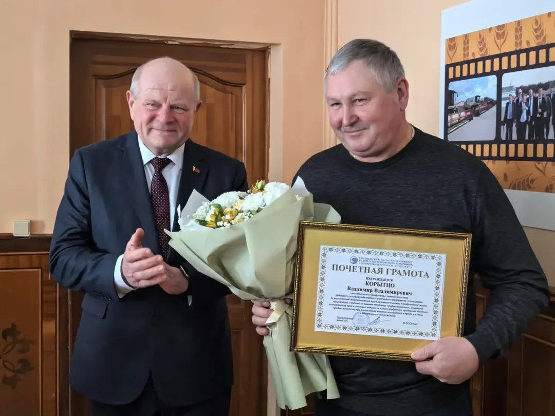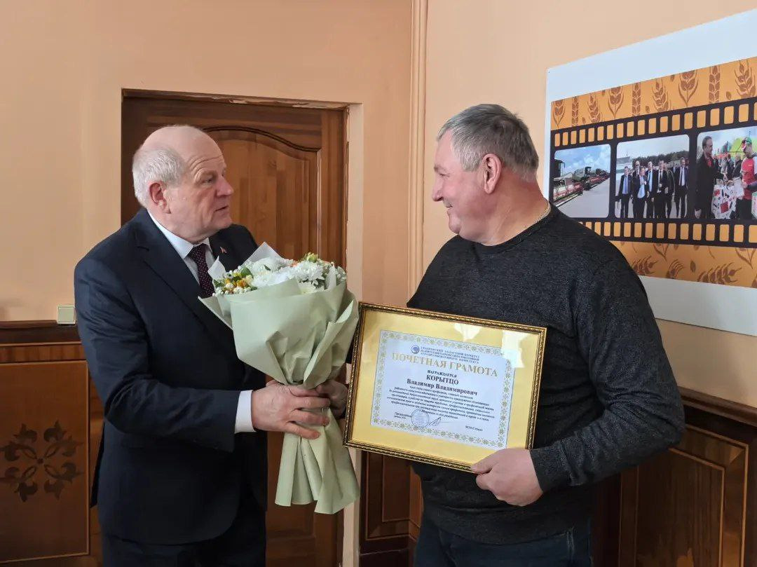 В этот праздничный день председатель Гродненской областной профсоюзной организации работников АПК Михаил Ситько вручил Почётную грамоту областной организации ветерану и наставнику: