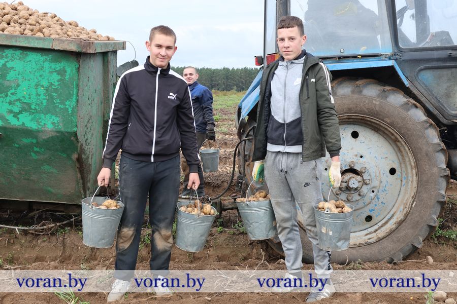 В экспериментальной базе «Октябрь» на картофельных полях многолюдно. Около двухсот человек ежедневно приходят на помощь хозяйству, в их числе — студотряд «Искра» имени ветерана Великой Отечественной войны Т.Я. Литовчика Вороновского колледжа.