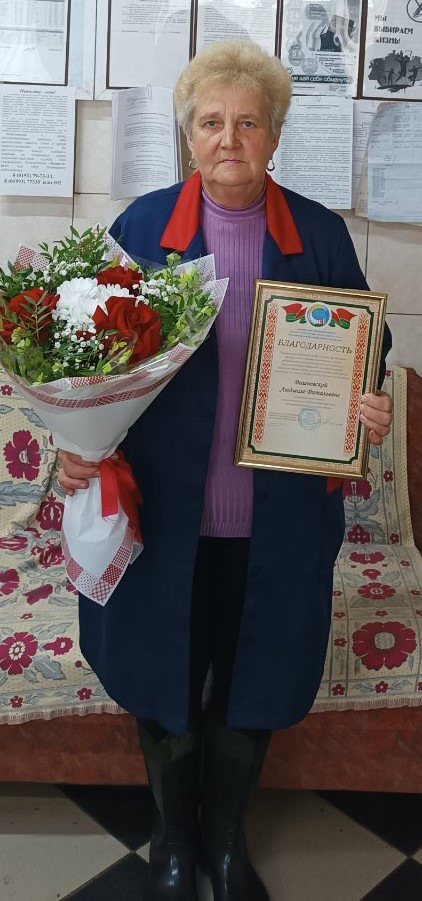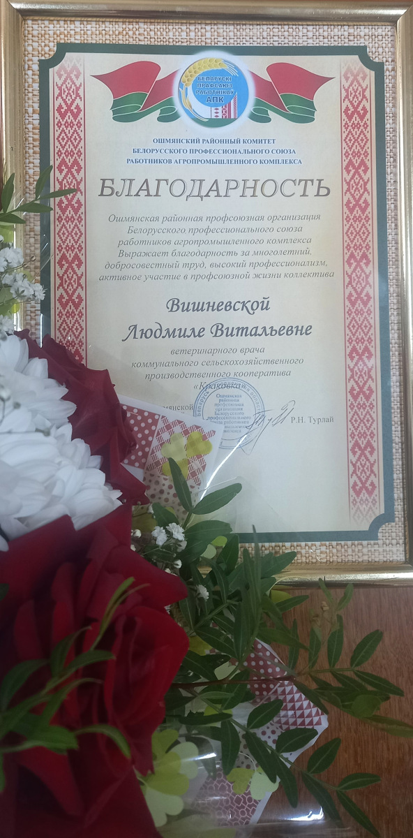 Благодарность Ошмянского районного профсоюзного комитета Белорусского профессионального союза работников агропромышленного комплекса награждена Вишневскаяа Людмила Витальевна, ветеринарный врач коммунального сельскохозяйственного производственного кооператива «Краковка».
