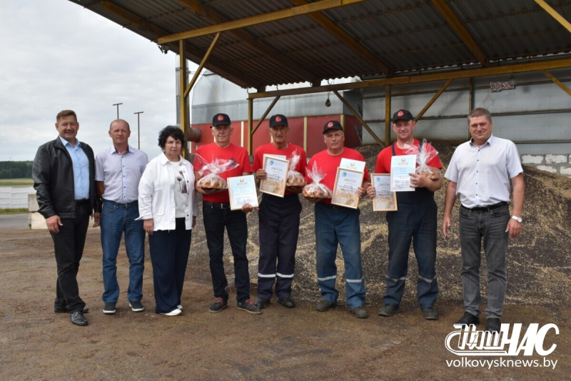 Поздравить работников зерносушильного комплекса «Лозы» с тем, что они первыми в районе преодолели рубеж в пять тысяч тонн просушенного зерна, приехали директор сельхозпредприятия Виктор Замировский, председатель Волковысской районной организации профсоюза работников АПК Валентин Заяц и другие. Победителями районного соревнования, организованного профсоюзом, стали заведующий складом Алексей Стоцкий, операторы сушильных установок Александр Косило и Владимир Красовский, слесари-ремонтники Владимир Дудинский и Евгений Котов. Их поблагодарили за работу и вклад в общий каравай района. Победителям подарили караваи, как символ отличного результата.