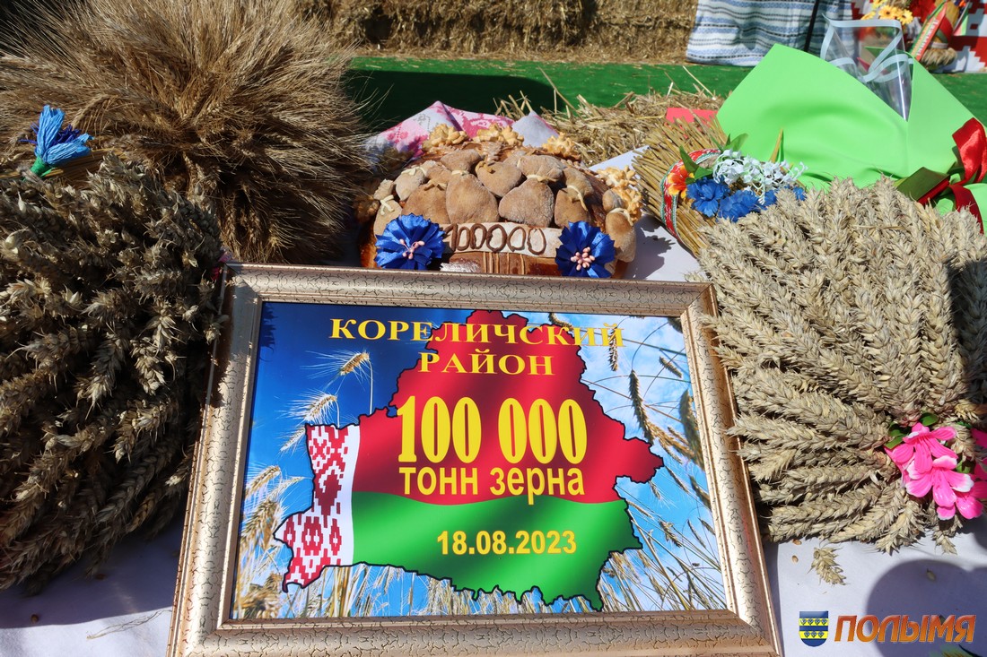 Какой праздник обходится без подарков? И совершенно точно не бывает праздника без сюрпризов. На сцену поднялись Евгений Бусько, Ирина Пеньковская и начальник отдела организации производства и механизации управления сельского хозяйства и продовольствия райисполкома Илья Самуйлик, которые присоединились к поздравлениям и объявили важную новость, вызвавшую шквал аплодисментов, — в Кореличском районе намолотили сто тысяч тон урожая! Каравай с заветной «сотней» и дожиночный сноп вручили главе района.