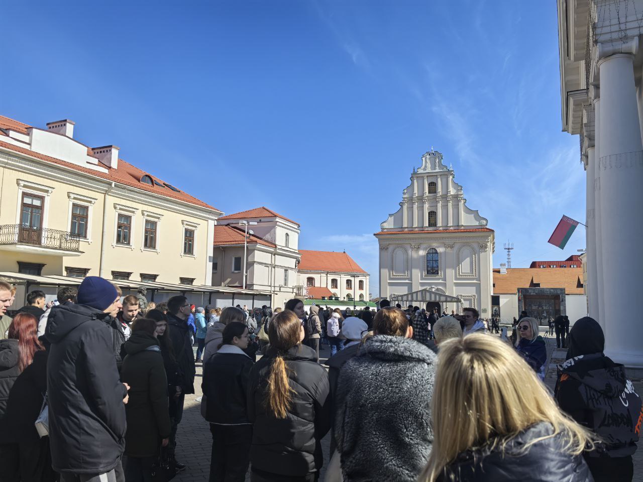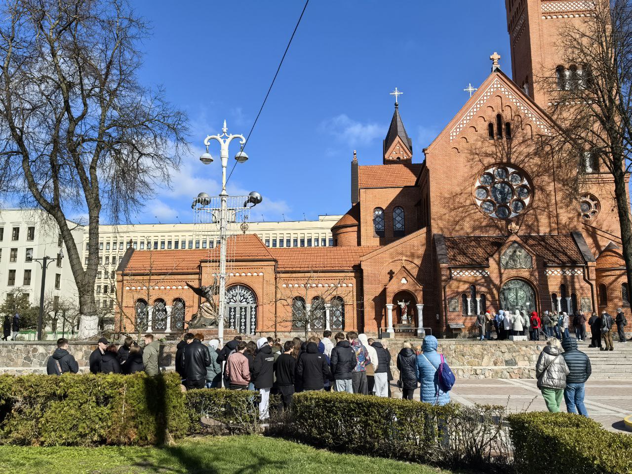 Затем студенты посетили окрестности «Костёла Святого Симеона и Святой Елены»( часто называемый также Красным костёлом — наиболееизвестный католический храм Минска.) где экскурсовод рассказывал историю этого костёла.