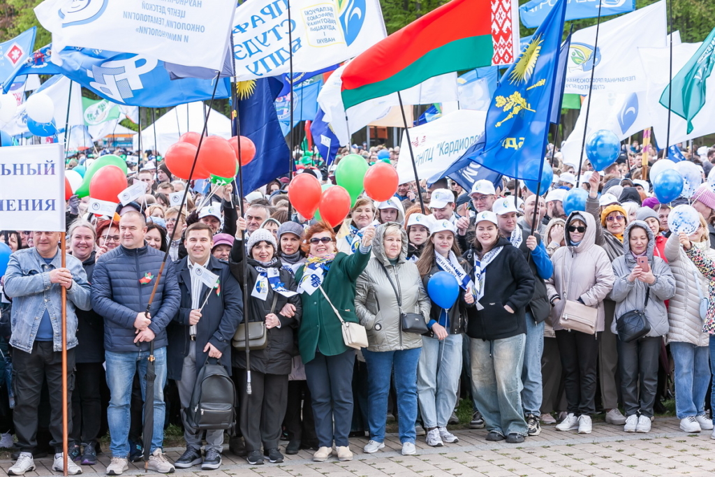 Приветствием сегодня звучит слоган: «Мир. Труд. Май». Беларусь ярко отмечает праздник. Шарики, цветы, улыбки, нарядные люди и улицы – первомайские маевки проходят во всех регионах страны. Самая масштабная по традиции – в парке Победы в Минске.