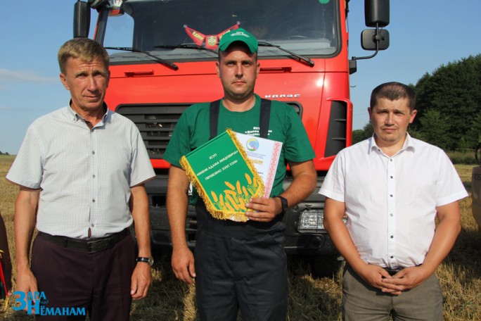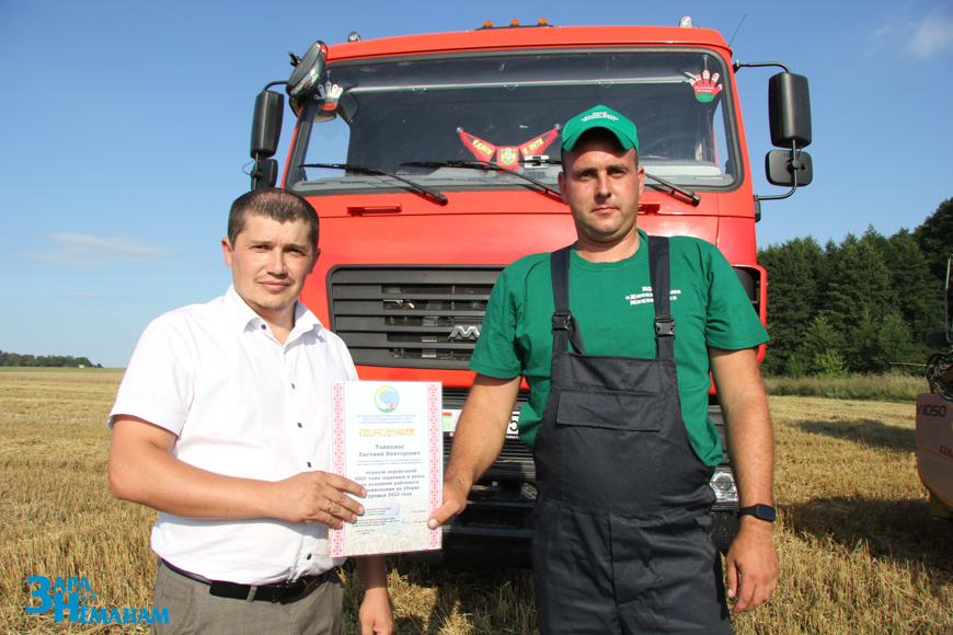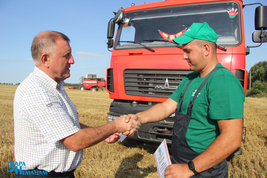 Поздравил молодого водителя с высоким достижением и вручил ему премию также председатель районной профсоюзной организации работников АПК Виктор Метлюк. Условия соревнования работников агропромышленного комплекса на жатве предусматривают участие в общем деле молодых комбайнеров и водителей. Поэтому Виктор Михайлович очень искренне и тепло поздравляет тех, кто первым добился высоких результатов, отмечает их премиями. Евгения Улинцкаса районная профсоюзная организация премировала по достижении каждой тысячи тонн.