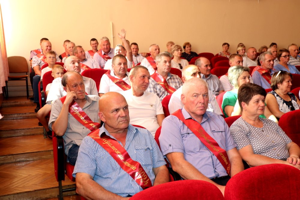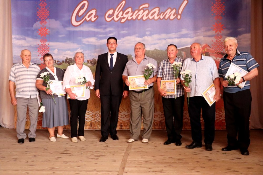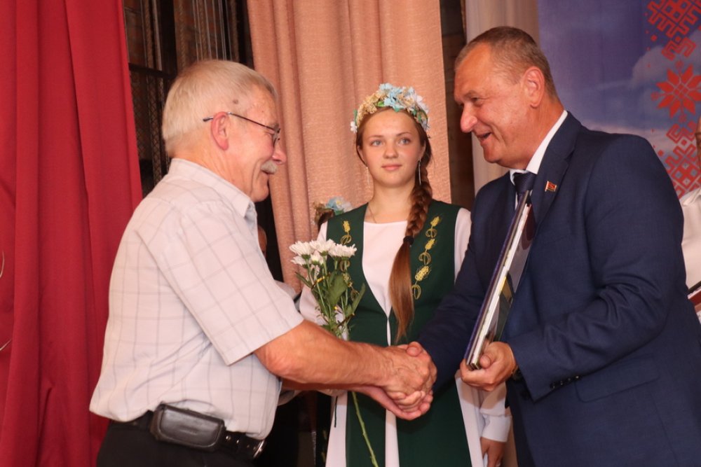 Герои жатвы, заслуженные работники и ветераны хозяйства принимали поздравления и награды от председателя райкома профсоюза работников АПК Валерия Парфенчика.