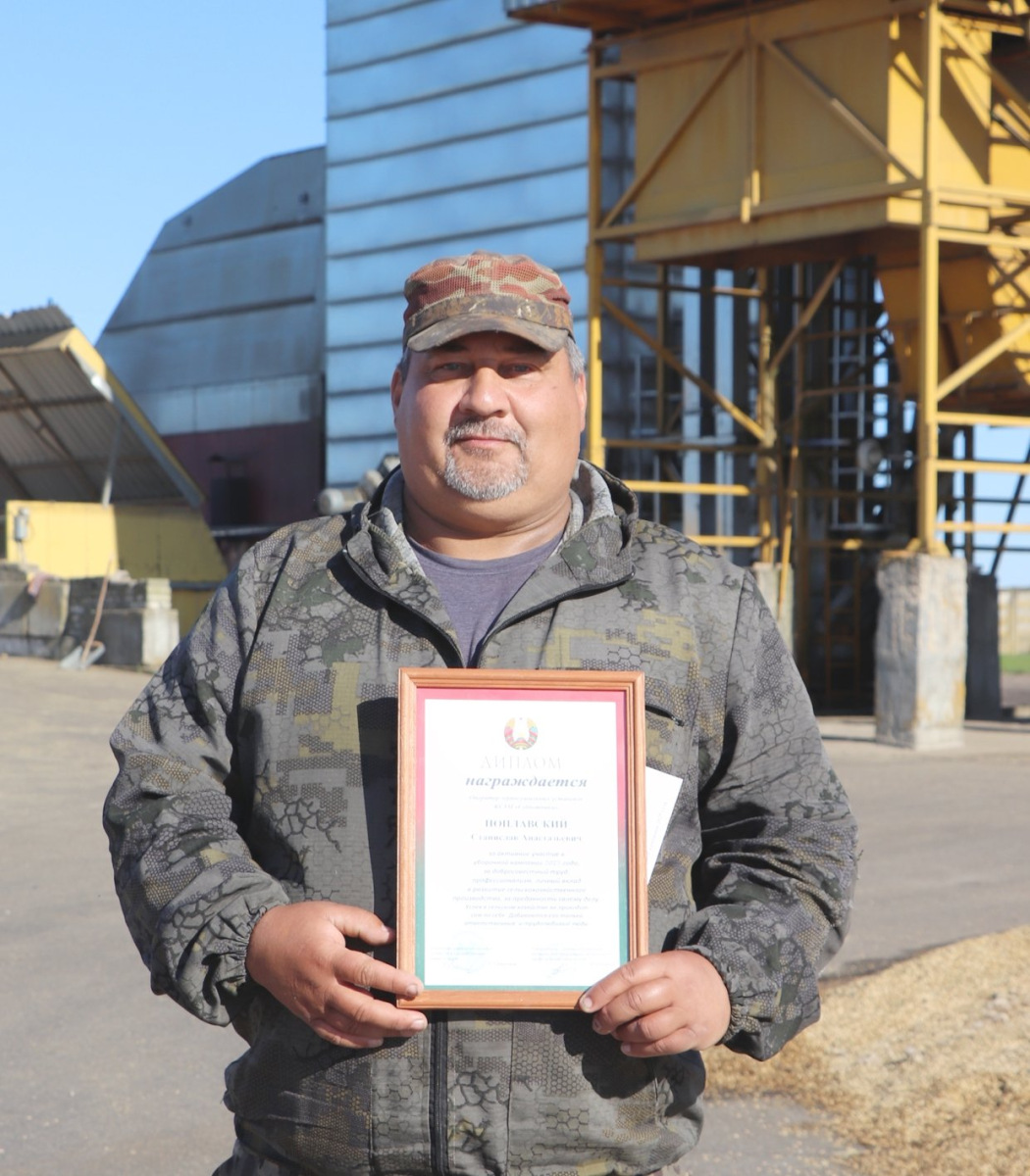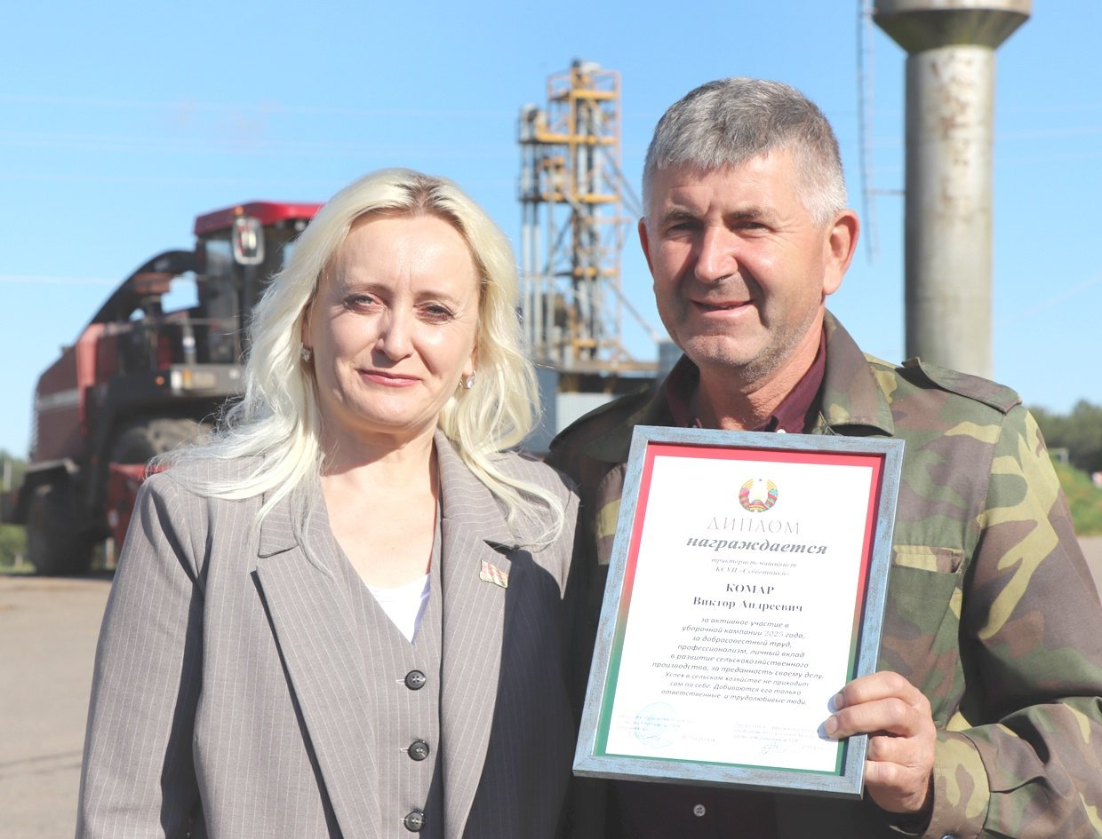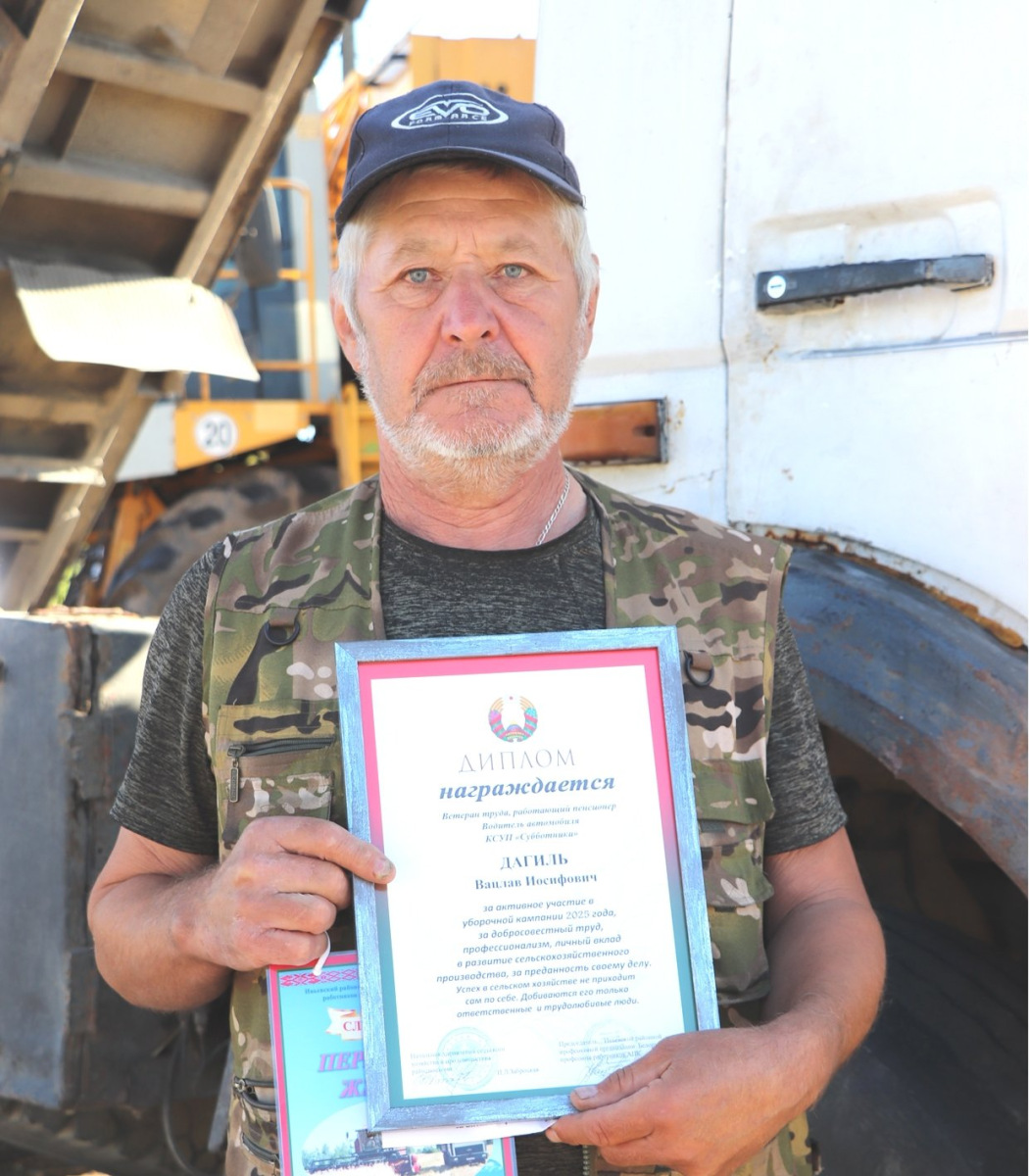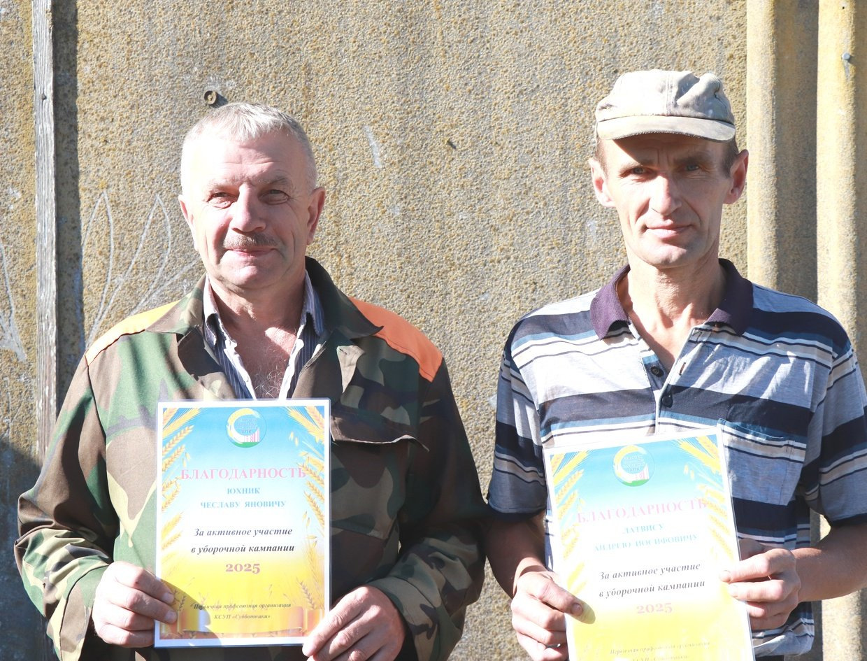 На 21 августа коллектив КСУП "Субботники" первым в районе взял планку в 95% - жатва приближается к финишу. Это стало возможно благодаря оптимизму и трудолюбию людей, которые внесли свой значимый вклад в итоговые цифры уборочной страды. Поздравили хлеборобов и вручили награды с денежными премиями первый заместитель председателя Ивьевского райисполкома, начальник управления сельского хозяйства и продовольствия Наталия Заброцкая, председатель Ивьевской районной профсоюзной организации Белорусского профессионального союза работников АПК Инесса Кулешо. - Очень приятно посещать предприятие, чтобы поздравить элиту уборочной кампании. Каждый из вас внес достойный вклад в жатву, и каждый из вас заслуживает только лучшего. Профсоюзная организация работников АПК всегда с радостью отмечает вклад наиболее активных участников уборки урожая, - сказала Инесса Кулешо. Наталия Заброцкая вручила Дипломы от районной профсоюзной организации Белорусского профессионального союза работников АПК "За активное участие в уборочной кампании 2025 года, за добросовестный труд, профессионализм, личный вклад в развитие сельскохозяйственного производства, за преданность своему делу" трактористам-машинистам: Анатолию Нарону, Виктору Стефановичу, Виктору Комару; водителю Вацлаву Дагилю; операторам зерносушильных установок – Дмитрию Яковичу и Станиславу Поплавскому. - Зерно – наше главное богатство, в сезон наши зерносушильные установки работают на полную мощность. Мы стараемся обеспечить работу без пауз и задержек. Спасибо профсоюзу за награды и внимание к нашему труду, - сказал Станислав Поплавский. - Время идет незаметно, вот уже пролетело полстолетия как я тружусь в сельском хозяйстве. Чувствую себя достаточно бодро, чтобы продолжать дело, начатое еще в молодости. В этом вижу свое призвание, - говорит ветеран труда Вацлав Дагиль. Профсоюзный лидер КСУП "Субботники" Наталья Калюта вручила награды от предприятия, их получили – Геннадий Анискевич, Анатолий Юруш, Александр Трубицкий, Павел Ракса, Станислав Синкевич, Чеслав Юхник, Леонид Петриман и Андрей Латвис.