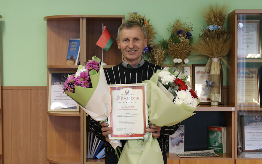 Павіншаваць Вячаслава Станіслававіча і ўручыць яму грамату за добрасумленную шматгадовую працу прыехаў старшыня раённай арганізацыі Беларускага прафсаюза работнікаў аграпрамысловага комплексу Уладзімір Казак. Ва ўпраўленні сельгаспрадпрыемства да яго далучылася лідар прафсаюзнай пярвічкі гаспадаркі Вольга Аўхім.