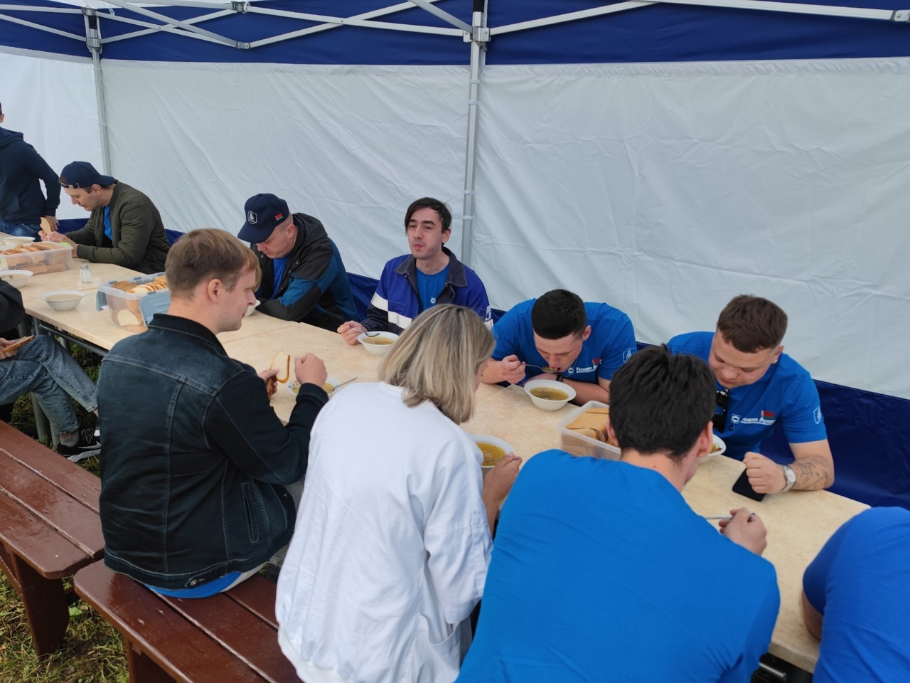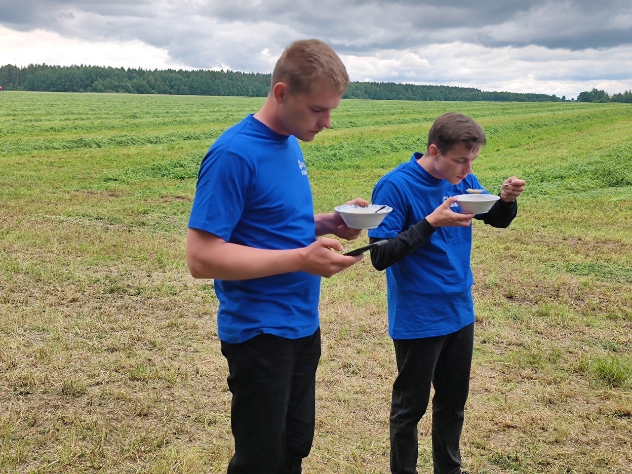 А затем - прямиком в поле, где активными темпами идет кормозаготовка. На поле в д.Викшняны идет процесс уборки люцерны, которая является ценной кормовой культурой с высоким содержанием белка, что положительно сказывается на питании дойного стада и его высоких удоях. Молодых людей угостили вкусным обедом прямо в поле.