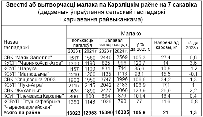 Па выніках працы за два месяцы 2024 г. вытворчасць малака склала 15867,2 тон, або 108,3% да 2023 г. (+1218,5 т). Сем сельскагаспадарчых арганізацый забяспечылі рост вытворчасці малака. Больш за ўсіх павялічылі вытворчасць у СВК “Жухавічы”, дзе прырост склаў 588,6 т (124,9% да ўзроўню мінулага году), СВК “Свіцязянка-2003” (313,2, 108,7%) і ДП “Лукі-Агра” (+243,2 т, або 112,5%), дзве гаспадаркі дапусцілі зніжэнне вытворчасці да ўзроўню 2023 года — ДП “Царука” — 89,7% (-81,8 т) і ДП “Птушкафабрыка “Чырвонаармейская” — 78,3% да ўзроўню 2023г. (-225,2 т). Заданне па вытворчасці малака выканана на 103,5%. У перадавіках — СВК “Жухавічы” (+282,7 т, 110,6%), ДП “Лукі-Агра” (+152,2 т, 107,5%) і СВК “Свіцязянка-2003” (+162,4 т, 104,3%). Не выканалі заданне тры прадпрыемствы: ДП “Царука” — 89,3%, КСУП “Малюшычы” — 99,8%; КСВУП “Птушкафабрыка “Чырвонаармейская” — 83,7%. За люты больш за ўсіх павялічылі вытворчасць малака СВК “Жухавічы” (+319,1 т), СВК “Свіцязянка-2003” (+169,7 т) і ДП “Лукі-Агра” (+103,9 т), зніжэнне дапусцілі дзве сельгасарганізацыі, ДП “Царука” і КСВУП “Птушкафабрыка “Чырвонаармейская”, гэтыя ж арганізацыі не выканалі і заданне за люты.