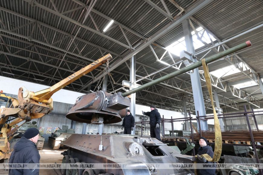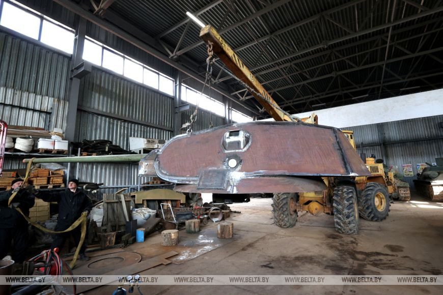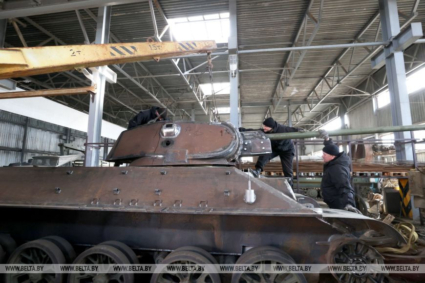 Реставраторы историко-культурного комплекса "Линия Сталина" трудятся над созданием редчайшего танка Т-34-57. В основе ходовой копии легендарной "тридцатьчетверки" элементы сразу трех боевых машин времен Великой Отечественной войны! Понаблюдать за тем, как на корпус боевой машины устанавливают башню и орудие, смогли и журналисты. Напомним: в августе прошлого года в Зельвенском районе при ремонте автодороги Р-99 дорожными рабочими были обнаружены части узлов и агрегатов боевой машины времен Великой Отечественной войны: по утверждению экспертов детали легендарного танка Т-34 самой редкой модификаций. По предварительной версии машина была взорвана фашистами. Отыскали тогда люк, броневую плиту, комплекты гусениц, траки гусеничной цепи, четыре катка, ленивца, приводную звездочку, стартер, элементы днища и другое. Все в комплексе передано в историко-культурный комплекс «Линия Сталина». По словам помощника директора историко-культурного комплекса Михаила Метлы, из уникальных находок с использованием современных запчастей и воссоздают военную технику времен военного лихолетья к 80-летию Великой Победы. Истребитель танков Вряд ли найдется белорус, не слышавший о легендарных Т-34. Эти танки не просто так прозвали "оружием Победы": именно они громили врага в битве за Москву, решили судьбу Сталинградской битвы, противостояли немецким "Тиграм" и "Пантерам" на Курской дуге. В наши дни "тридцатьчетверки" установлены на большинстве постаментов в честь освобождения Беларуси от немецко-фашистских захватчиков. Однако далеко не каждый знает, что у самой известной советской боевой машины была редкая модификация Т-34-57, получившая название "истребитель танков". В 1941 году было построено всего десять танков Т-34 с 57-мм пушкой. Все они приняли участие в знаменитом рейде на Калинин (сейчас Тверь. - Прим. БЕЛТА) по тылам врага 21-й танковой бригады под командованием Героев Советского Союза Михаила Лукина и Михаила Агибалова. Еще четыре машины построили в 1943 году. С появлением более мощного 85-мм танкового орудия выпуск "тридцатьчетверок" с 57-мм пушкой прекратили. Ходовая копия именно такого танка сейчас строится на "Линии Сталина". По словам исполнительного директора историко-культурного комплекса Александра Метлы, машина изготавливается на базе советского среднего артиллерийского тягача АТС-59. Ради исторической достоверности его корпус расширили и удлинили, сделав характерный для ходовой "тридцатьчетверки" удлиненный промежуток между вторым и третьим катком. "Изготавливаемый нами танк будет с корпусом 1940 года и 57-мм пушкой ЗИС-2. Мы делаем Т-34 первых выпусков. Такой корпус изготавливался еще до войны. Отличается он рубкой и люком механика-водителя, расположением триплексов. Башня "пирожок" на нем была достаточно тесной, неудобной с точки зрения танкиста, но это характерно для машин именно довоенной постройки", - уточняет Александр Метла. Почему же Т-34-57 прозвали "истребителем танков"? Все дело в 57-мм пушке, чьи бронебойные снаряды пробивали большую толщину брони, чем 76-мм снаряды на обычных танках Т-34. Пушка ЗИС-2 была настолько эффективной, что все немецкие танки прошивала насквозь с обоих бортов, причем даже по диагонали. Сложно даже представить, какой мощностью она обладала, раз была снята с вооружения с формулировкой "в связи с избыточной бронепробиваем