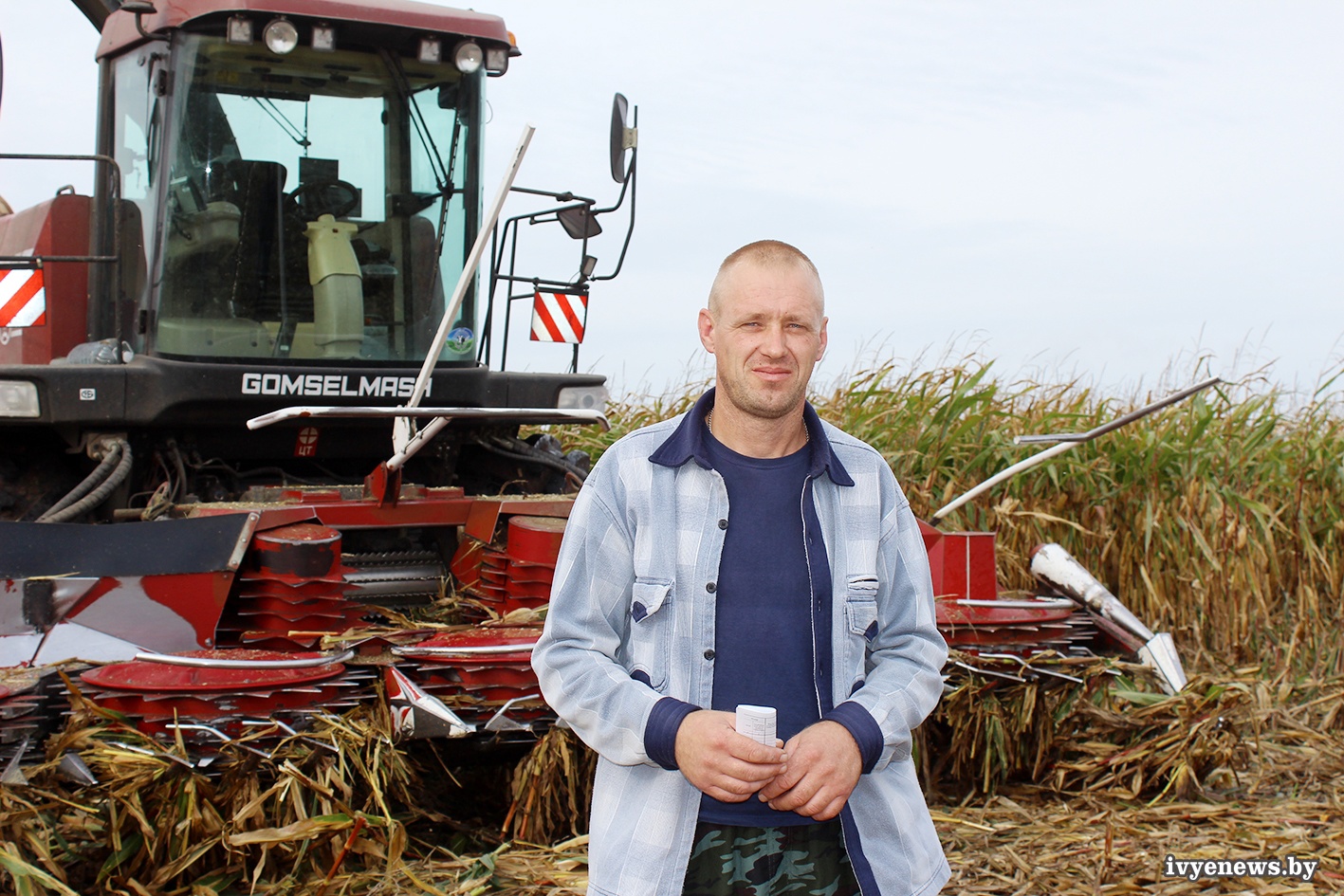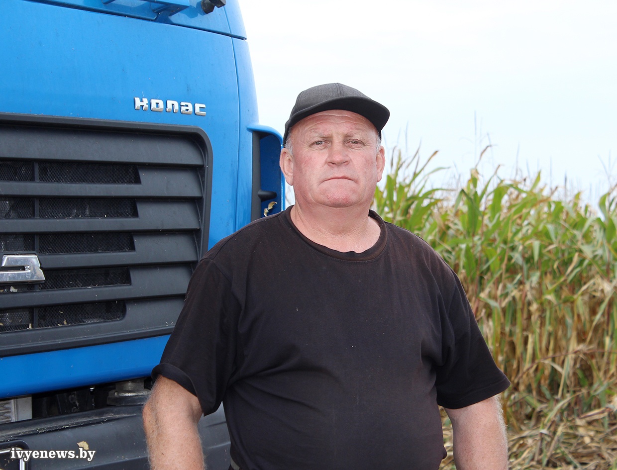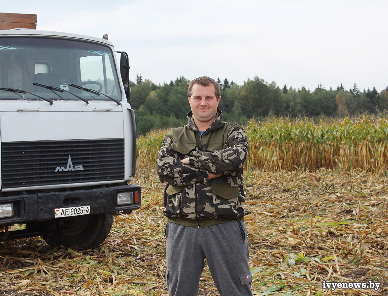 - В районе д.Крупли к уборке кукурузы на силос сегодня приступили первый день. Участок немаленький, всего около 100 га. Кукуруза выросла хорошая, сердце радуется. Октябрь, а еще зеленый вид у стеблей. Урожайность и питательность початков обеспечены технологией возделывания культуры. На сегодняшний день выбираем участки, где больше зеленого листа, подсохшую - оставляем на зерно. На отвозке измельченной массы трудится семь машин.Сегодняшний фронт работ водители Юрий Захар, Николай Шибайло, комбайнер Алексей Дедуль.