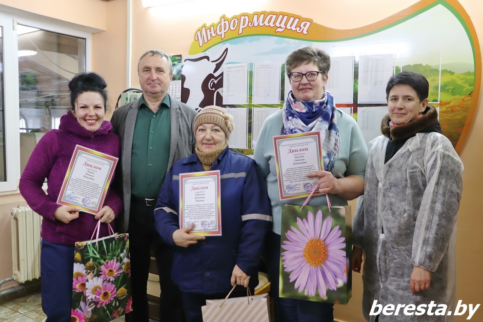 Дипломами Берестовицкого районной организации Белорусского профсоюза работников АПК и ценными подарками от райкома профсоюза и от первичной профсоюзной организации были награждены оператор животноводческих комплексов и механизированных ферм Наталья Левшик, животноводы Валентина Габрусевич, Светлана Эйсмонт, Татьяна Дмитриева, Дмитрий Синицын, Александр Казакевич, Юрий Мартысевич, Геннадий Русилко, зоотехник-селекционер Инна Обухович, заведующая цехом репродукции Тамара Затовка, ветврач Елена Прокопчук, оператор свиноводческого комплекса Ирина Молош, а также ветеринарный фельдшер Алина Коженевская.
