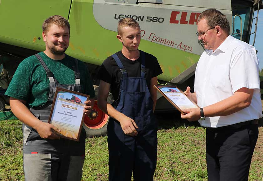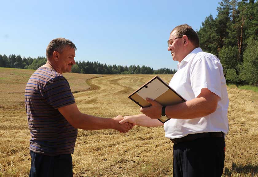 У КСУП “Жукоўшчына” віншаванні ад старшыні райвыканкама Андрэя Садоўскага і кіраўніка гаспадаркі Васіля Алесюка прымаў камбайнавы экіпаж Аляксандра Аўцынава і Арцёма Фурса – пераможцы раённых і абласных прафсаюзных спаборніцтваў на ўборцы.