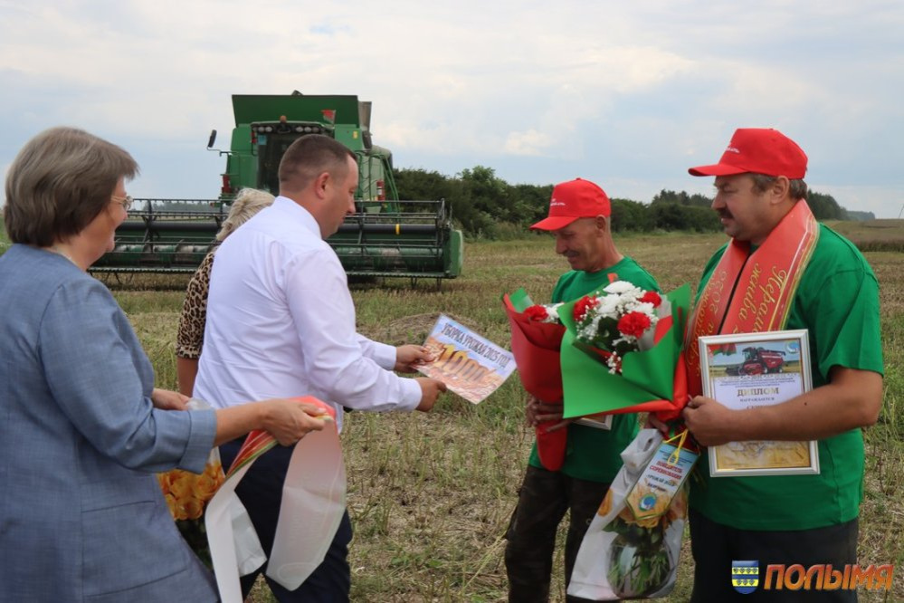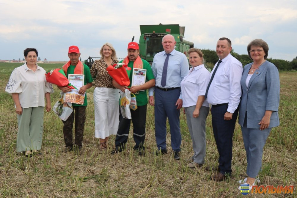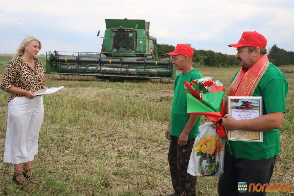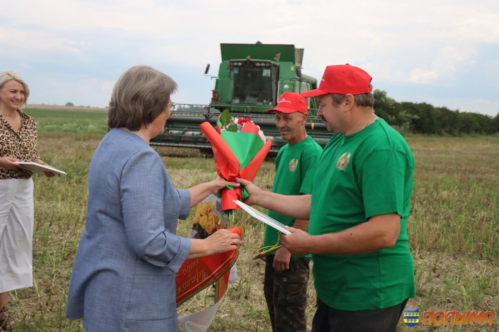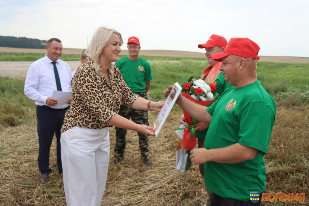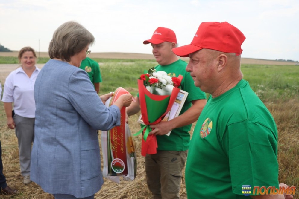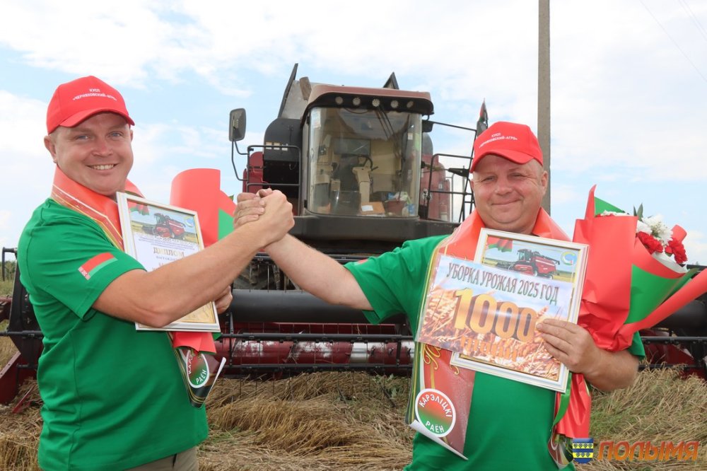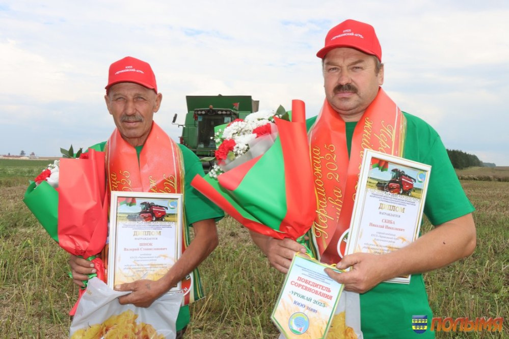 Урожайность зерновых и зернобобовых культур в этом году на кореличской земле радует – 77,1 центнера зерна на круг. Лидерство по урожайности в области Кореличчина удерживает уже несколько недель подряд, поэтому число экипажей-тысячников с каждым днем солидно прибавляется. На 4 августа насчитывается 10 таких экипажей, в том числе один семейный, и три водителя на отвозке зерна. В этот день сразу два экипажа-тысячника из ГП «Черняховский-Агро» принимали награды, премии и цветы прямо в поле. Наилучшие слова поздравлений прозвучали от председателя Кореличского райисполкома Андрея Гордея, первого заместителя председателя – начальника управления сельского хозяйства и продовольствия райисполкома Евгения Бусько, заместителя председателя Гродненской областной профсоюзной организации Белорусского профсоюза работников агропромышленного комплекса Алеси Венско и председателя райкома профсоюза работников АПК Ирины Пеньковской. Заветную тысячу тонн зерна из бункера комбайна Джон-Дир Т-670 выдал экипаж Николая Скибы и Валерия Шнока. - Первую тысячу сложнее всего намолотить, - говорит Валерий. – Мы с Николаем второй год в одной кабине комбайна на жатве. В минувшем году собрали 2 тысячи тонн. Думаю, в этом году возьмем не меньше, ведь хлеба на полях стоят хорошие. Еще один экипаж в составе Юрия Безушко и Андрея Людкевича намолотил заветную тысячу на отечественном комбайне КЗС 1218. Андрей Людкевич – опытный слесарь, но летом спешит на помощь родному хозяйству, чтобы убрать хлеб. - Работаю в ГП «Черняховский-Агро» инженером, а во время жатвы каждая пара рук не лишняя, поэтому уже четвертый сезон за штурвалом комбайна, - делится Юрий. – Очень люблю период жатвы. Когда в бункер сыплется зерно и слышу этот шелест, душа радуется, поет. Мой старший сын Матвей сейчас работает в нашем хозяйстве на зернотоке, получает первый трудовой опыт. Говорит, что пойдет по моим стопам и выберет профессию инженера. Это очень радует, ведь мой отец тоже аграрий, так что у нас получится уже настоящая династия. Водитель МАЗа 555 Александр Пасюкевич в этот день тоже был в центре внимания: на его счету заветная тысяча тонн перевезенного хлеба. -Я за рулем уже 42 года, из них 10 лет на жатве. Мой рекорд – 1 тысяча 800 тонн хлеба. Сейчас стараемся не упустить ни одной минуты хорошей погоды, работаем допоздна, торопимся, чтобы засыпать зерно в закрома. Заместитель председателя Гродненской областной профсоюзной организации Белорусского профсоюза работников агропромышленного комплекса Алеся Венско отмечает: - Наш профсоюз всегда идет рука об руку с тружениками полей и ферм. Теперь, в период жатвы, мы приезжаем прямо к комбайнам, автомобилям и на зернотоки, чтобы поблагодарить наших хлеборобов за труд, пожать им руку и вручить премии. Например, в прошлом году за период жатвы мы наградили 180 человек, в текущем году планируем оказать внимание 250 аграриям. Инна ЛЕЙКО