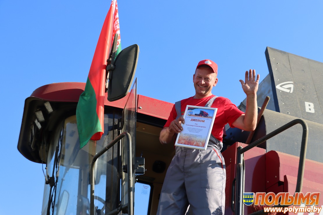 В поле за деревней Долгиново нас ожидает механизатор Александр Гиз из КСУП «Малюшичи». Принимая заслуженную награду, мужчина не скрывает улыбки. Признается, что с детства мечтал работать на комбайне, и вот мечта осуществилась — с 1996 года он работает механизатором.