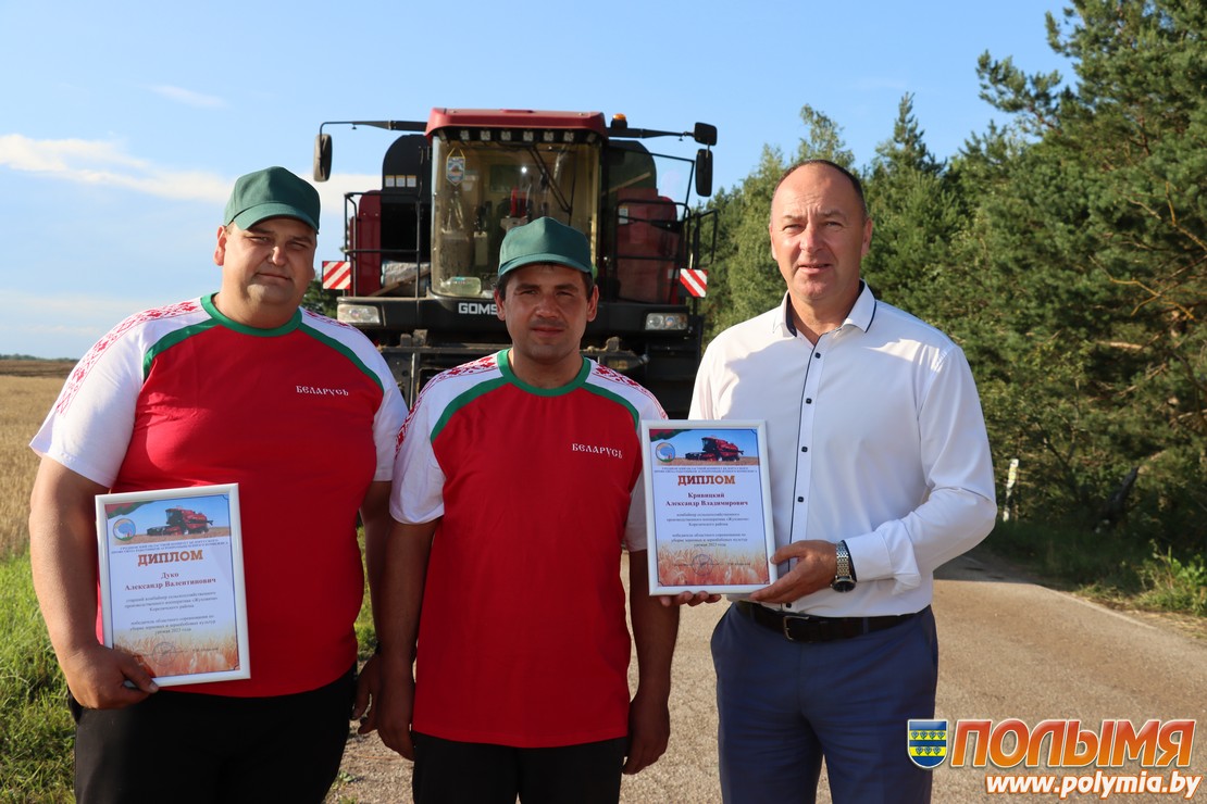 Председатель Кореличского райисполкома Геннадий Шатуев, первый заместитель председателя, начальник управления сельского хозяйства и продовольствия Евгений Бусько и председатель профсоюзной организации работников АПК Кореличчины Ирина Пеньковская поздравили комбайнеров, намолотивших 1000 тонн урожая 2023 года.