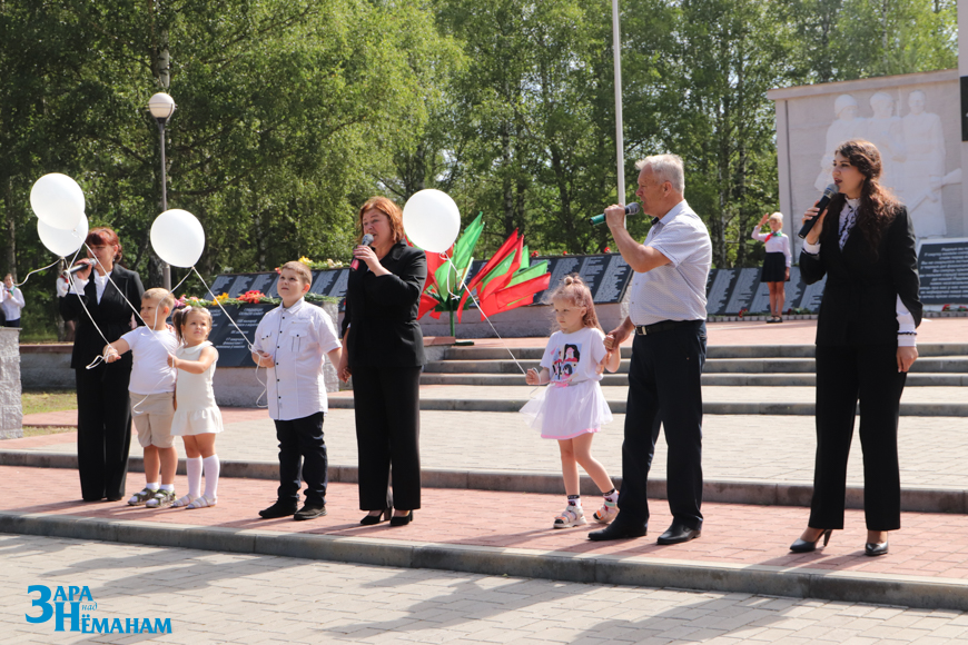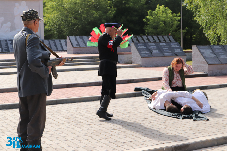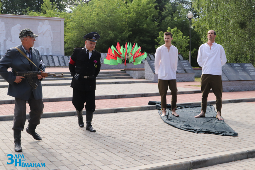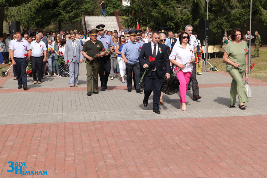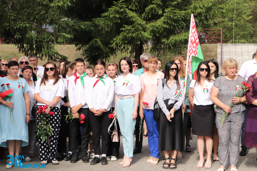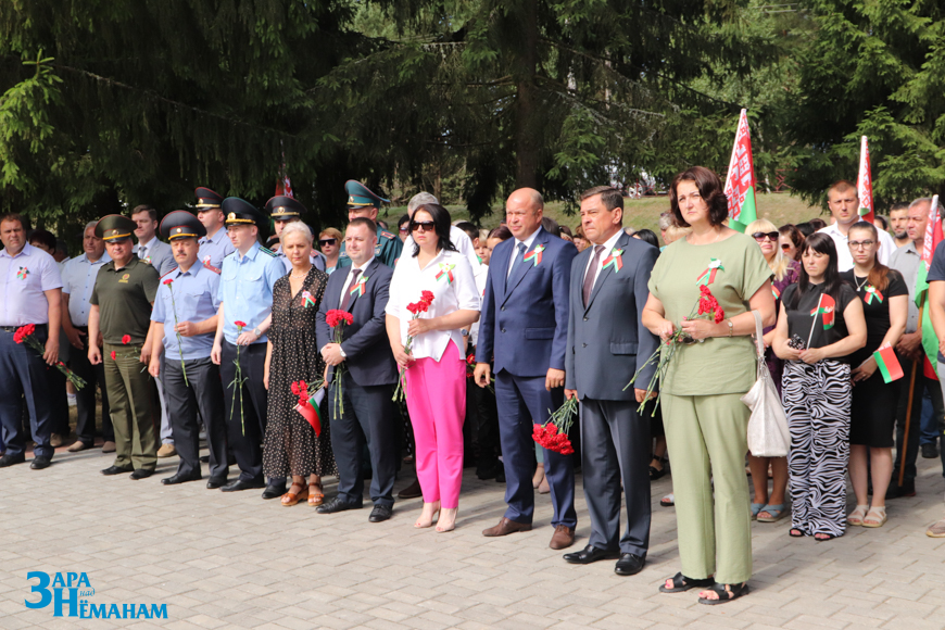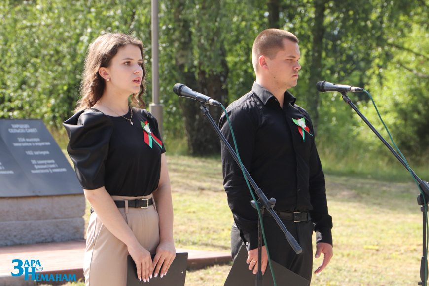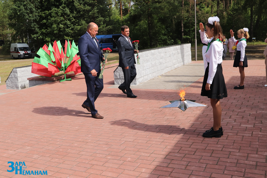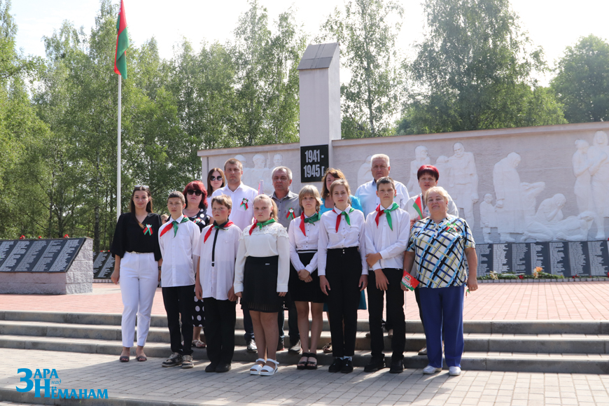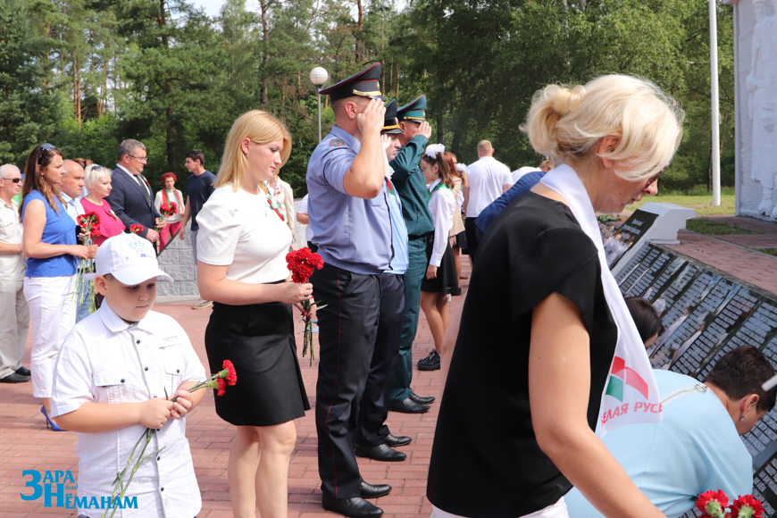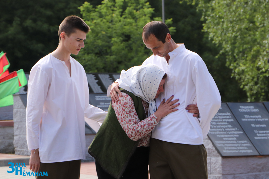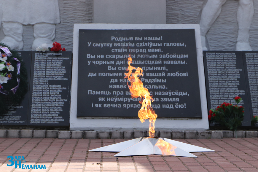 Гучыць метраном, што адлічвае хвіліну маўчання… Рэхам у вершалінах дрэў і над воднай гладдзю Шчары раздаецца яго шчымліва-трывожны гук. Да падножжа мемарыяла кладуцца жывыя кветкі ад удзячных нашчадкаў…