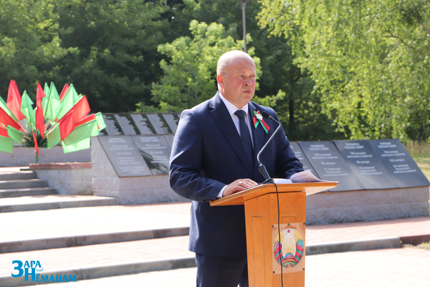 – Збіраючыся тут, на гэтым свяшчэнным для мастаўчан месцы, мы ўспамінаем тых, чый лёс апаліла вайна, аддаём даніну памяці ўсім, хто здабыў Вялікую Перамогу, хто безыменным спіць у брацкіх магілах, хто без вестак прапаў у барацьбе з карычневай чумой, – падкрэсліў старшыня Мастоўскага райвыканкама Андрэй Санько, звяртаючыся да землякоў падчас урачыстага мітынга-рэквіема. – За гады акупацыі, якая працягвалася для мастаўчан 1 115 дзён і начэй, фашысты замучылі і расстралялі 2680 нашых землякоў, 950 мастаўчан не вярнуліся з фронту, больш за 100 загінулі ў партызанскіх атрадах, каля 1000 ураджэнцаў раёна былі вывезены на прымусовыя работы ў Германію.
