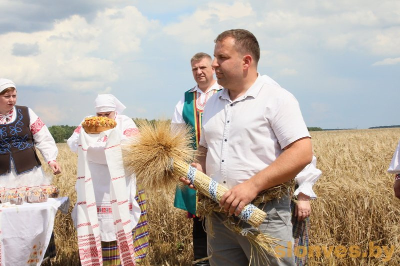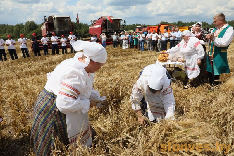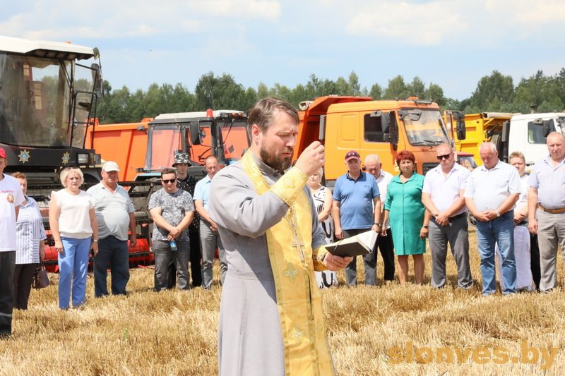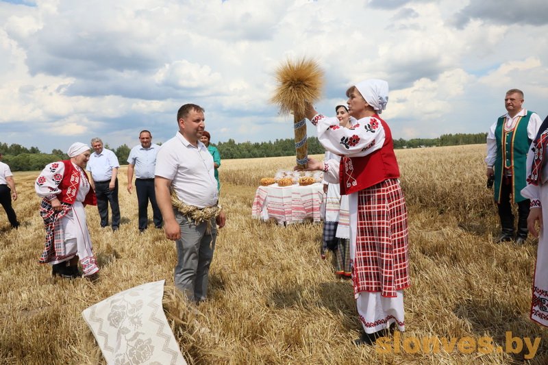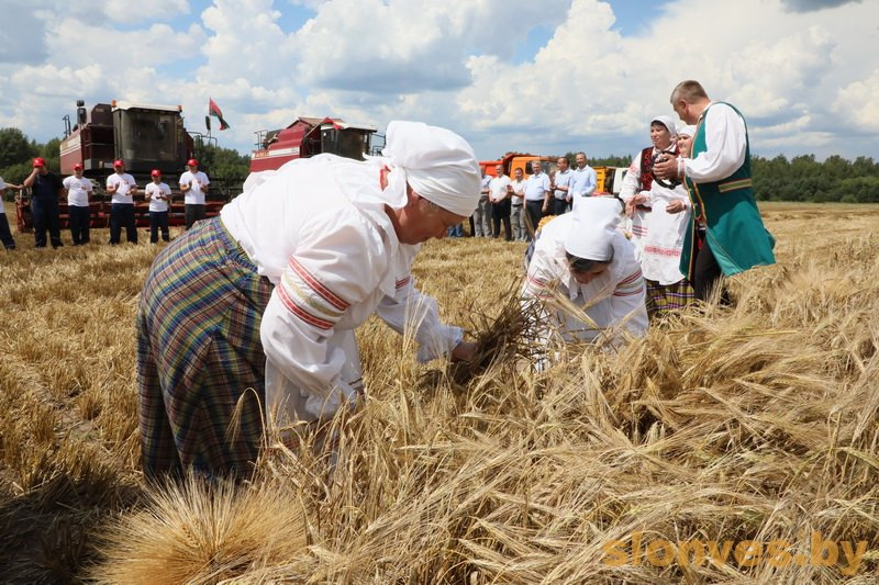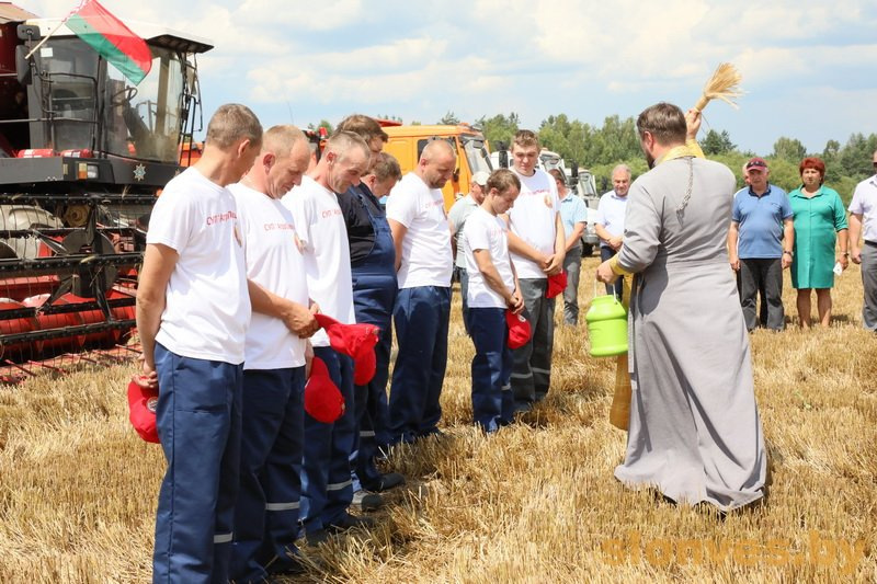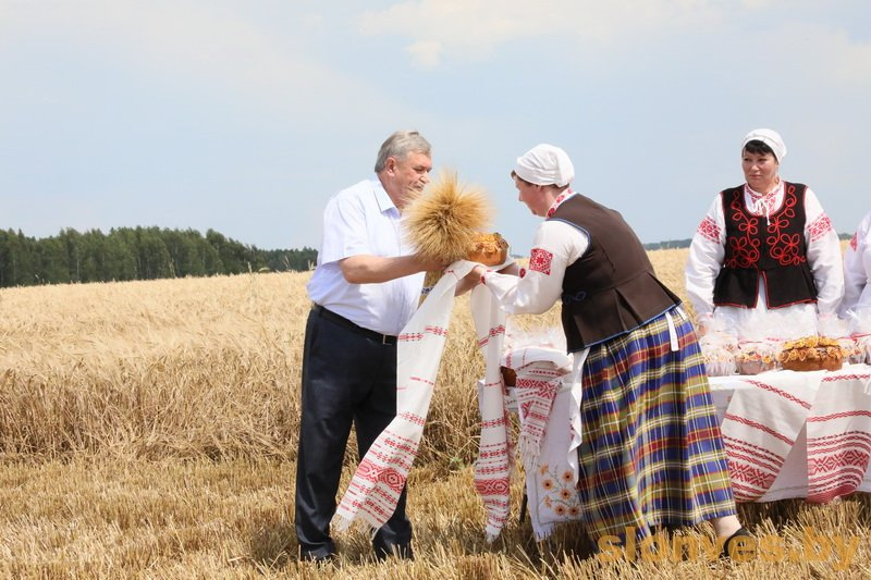 После благословения священника старейшая жнея Людмила Васильевна Герасимчик сжала первые колосья и пучком из них обвязала себя и руководителя хозяйства, пожелав ему здоровья и сил выдержать предстоящую горячую пору. Затем был сжат первый сноп, который задобрили хлебом, сыром и квасом: на хорошую погоду, богатый урожай, доброе здоровье.