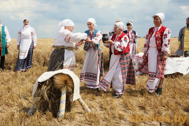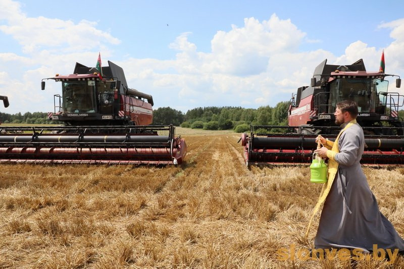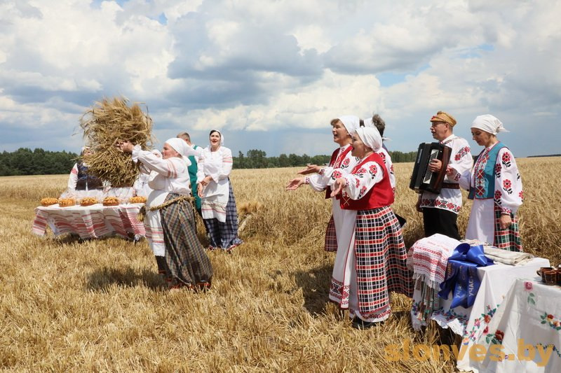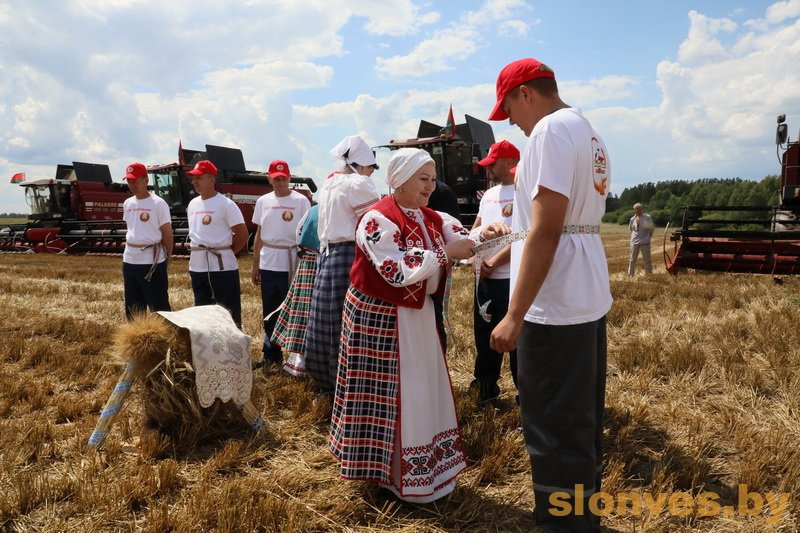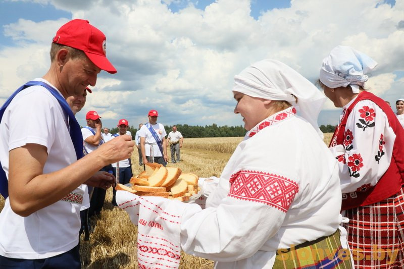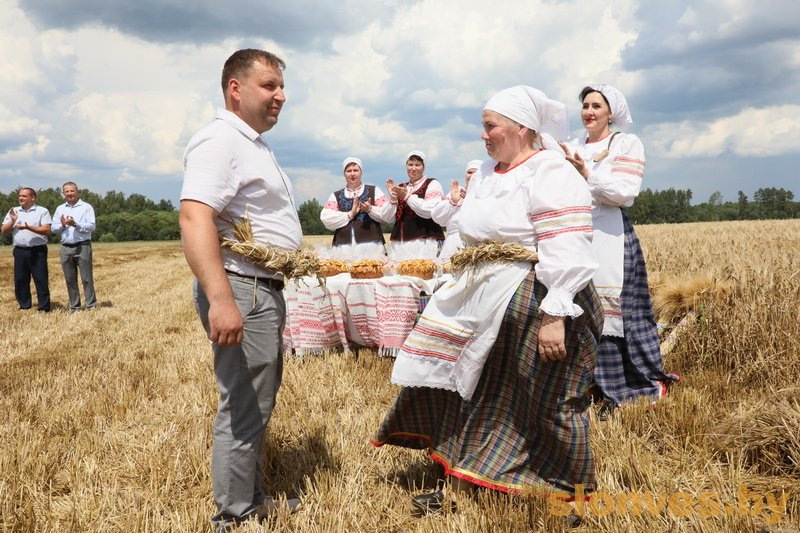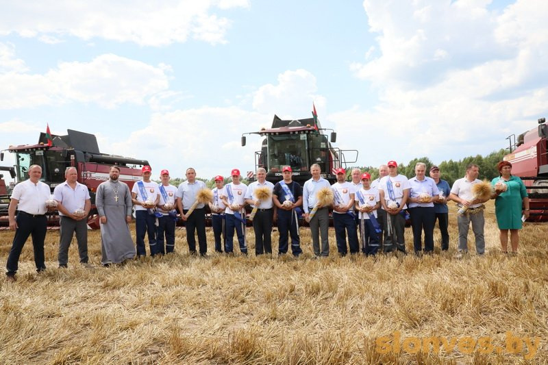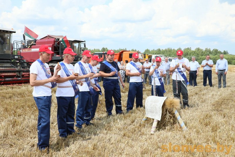 После благословения священника старейшая жнея Людмила Васильевна Герасимчик сжала первые колосья и пучком из них обвязала себя и руководителя хозяйства, пожелав ему здоровья и сил выдержать предстоящую горячую пору. Затем был сжат первый сноп, который задобрили хлебом, сыром и квасом: на хорошую погоду, богатый урожай, доброе здоровье.