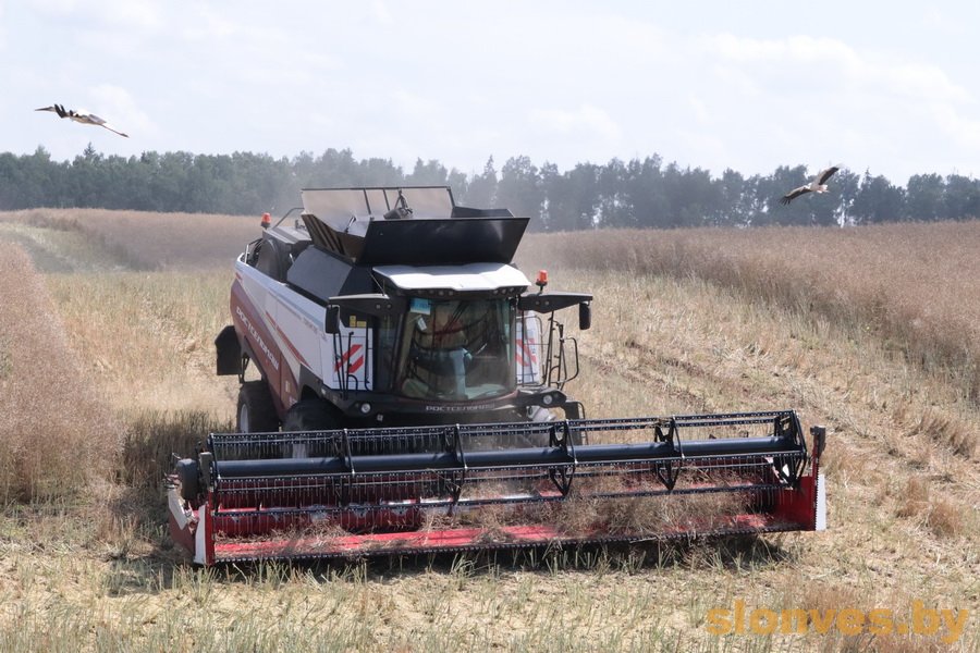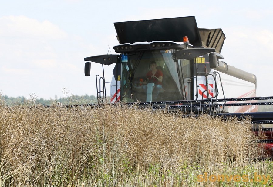 Масличная культура на полях созрела и теперь задача одна – убрать ее быстро и без потерь. Накануне прошел дождь, поэтому с утра аграрии не могли приступить к жатве. — Пришлось выезжать в поле только после обеда, из-за прошедшего вчера дождя рапс был влажноватый, — отметил заместитель директора по основной деятельности Василий Вацлавович Ашурок.