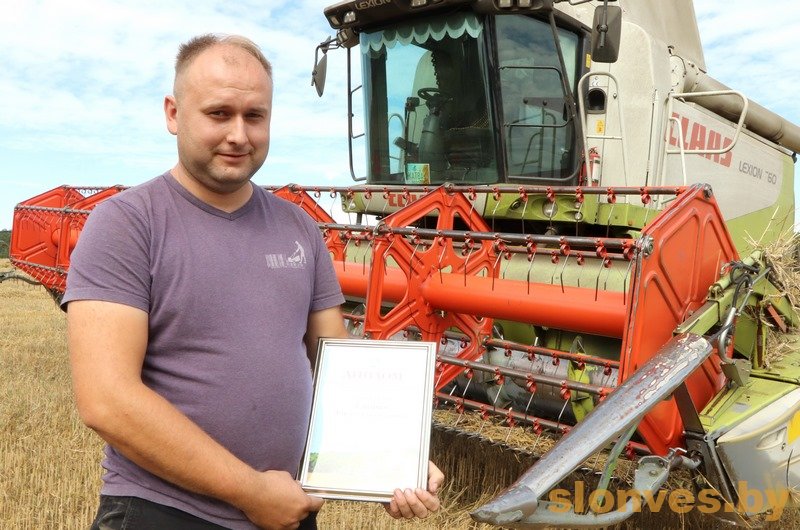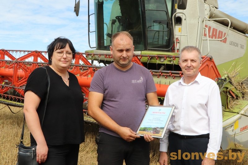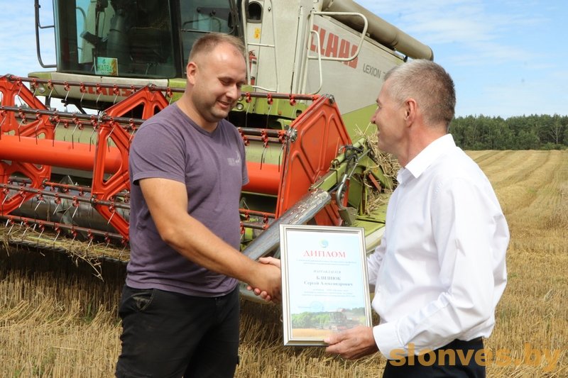 Чествовали героя жатвы прямо в поле председатель райкома профсоюза работников АПК Александр Зинченко и председатель Слонимского районного объединения профсоюзов Ольга Радевич. Молодой человек был отмечен Дипломом Слонимского районного комитета Белорусского профсоюза работников агропромышленного комплекса и денежным вознаграждением. Сергей Александрович – комбайнер бывалый, опытный, хоть и молодой еще. Работает в «Органик лэнд» со дня его основания, а в целом проводит девятую уборочную кампанию.