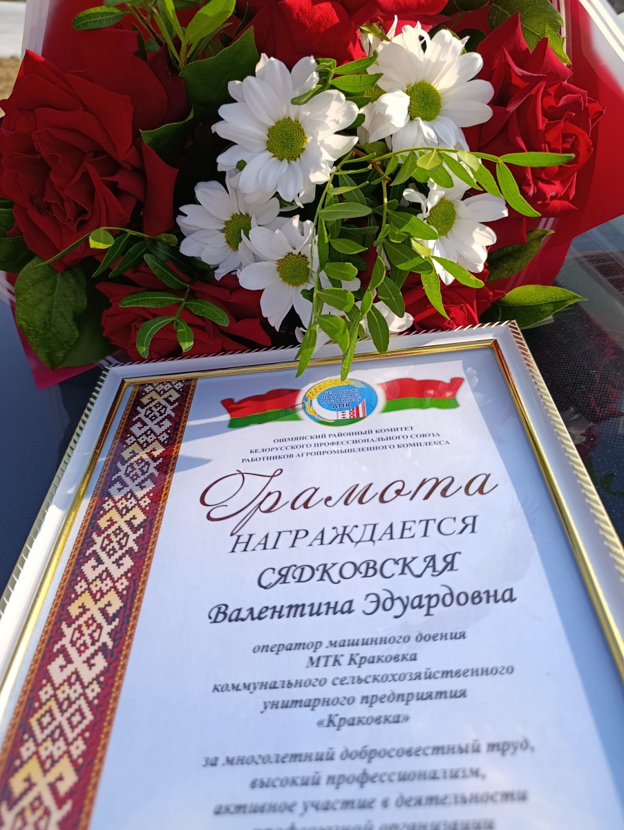 Грамотой Ошмянского районного комитета Белорусского профессионального союза работников агропромышленного комплекса награждена СЯДКОВСКАЯ Валентина Эдуардовна, оператор машинного доения МТК Краковка коммунального сельскохозяйственного унитарного предприятия «Краковка», за многолетний добросовестный труд, высокий профессионализм, активное участие в деятельности профсоюзной организации и в связи с юбилеем со дня рождения!