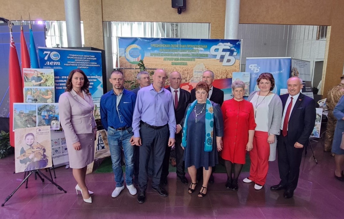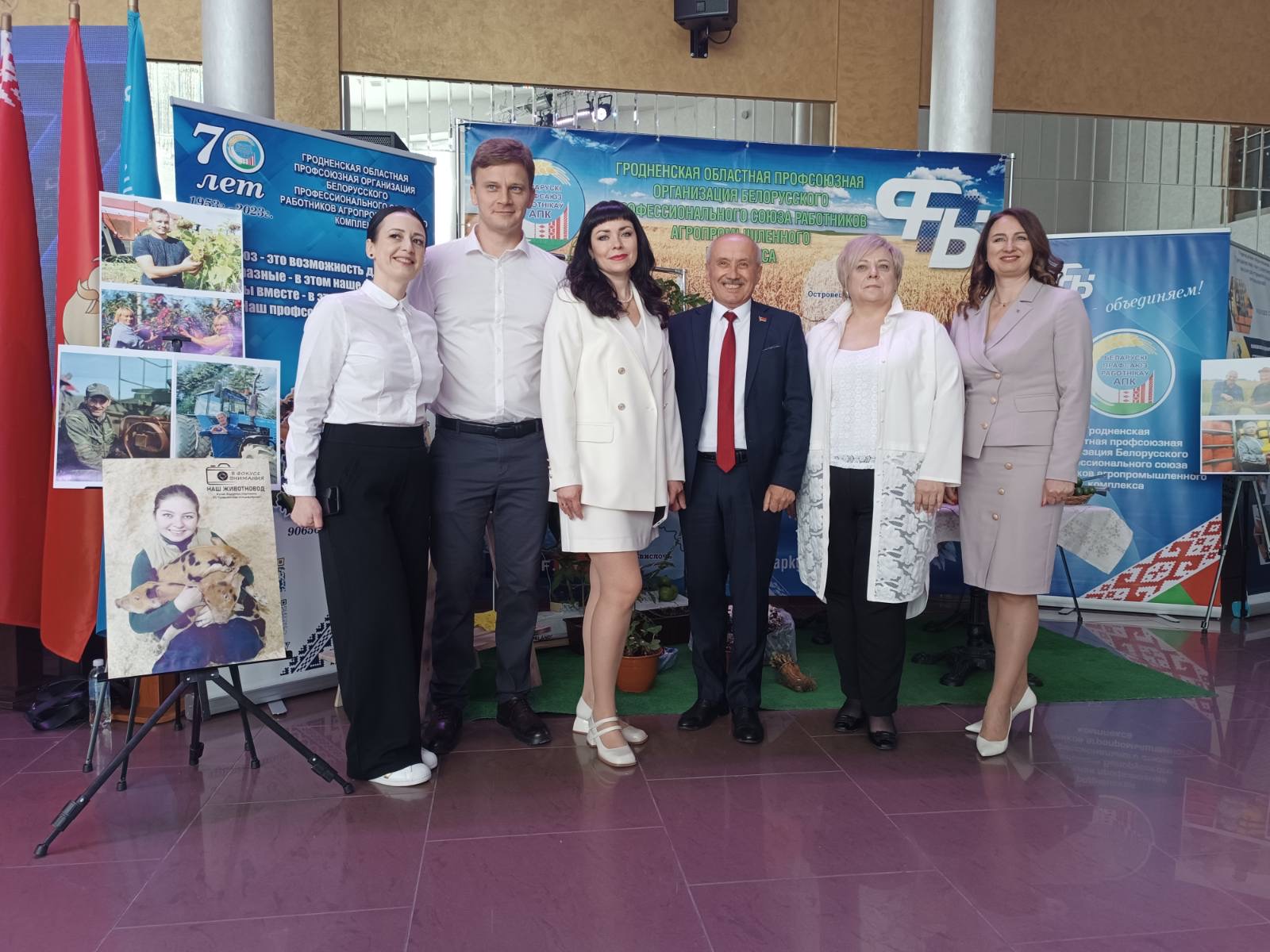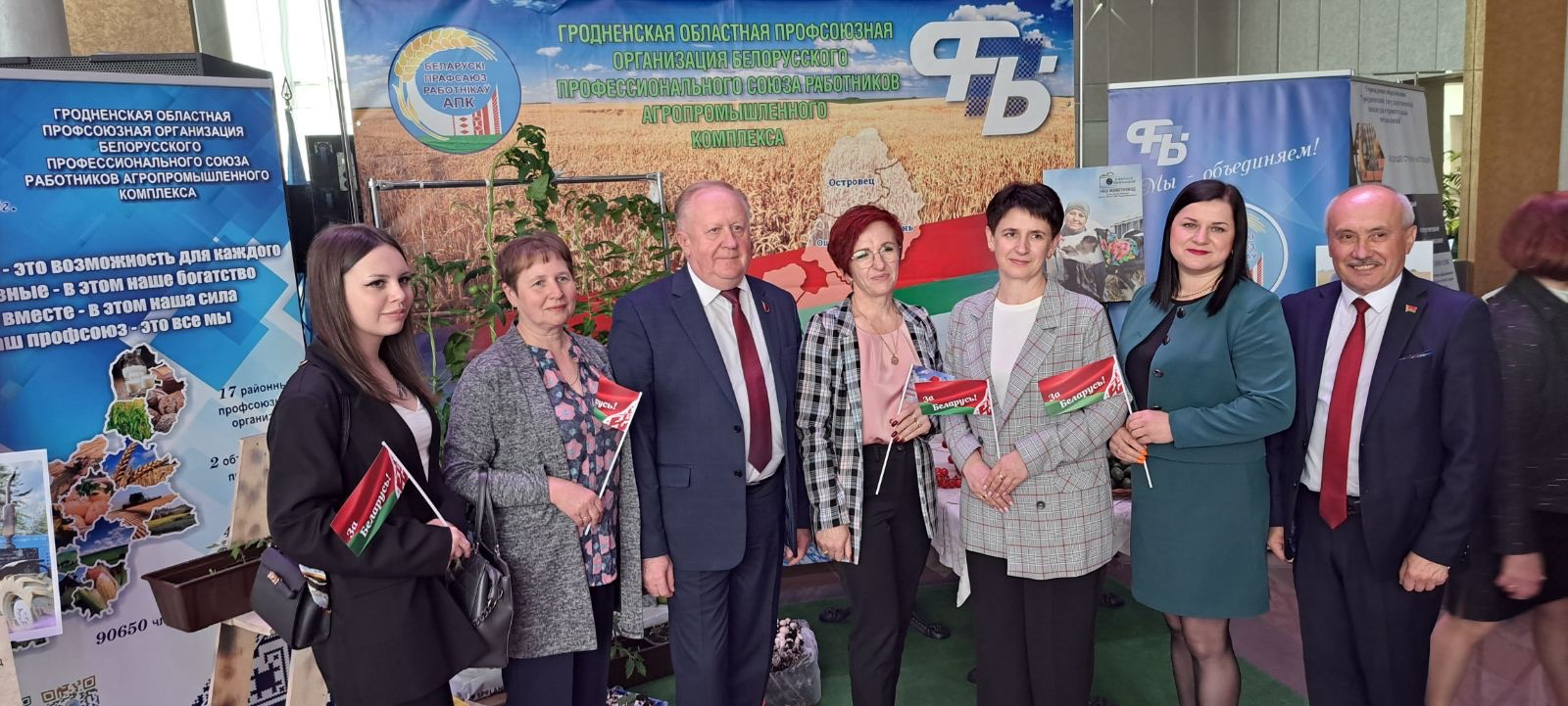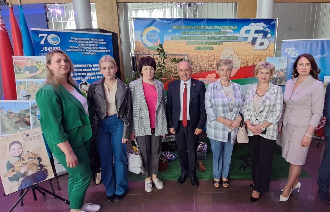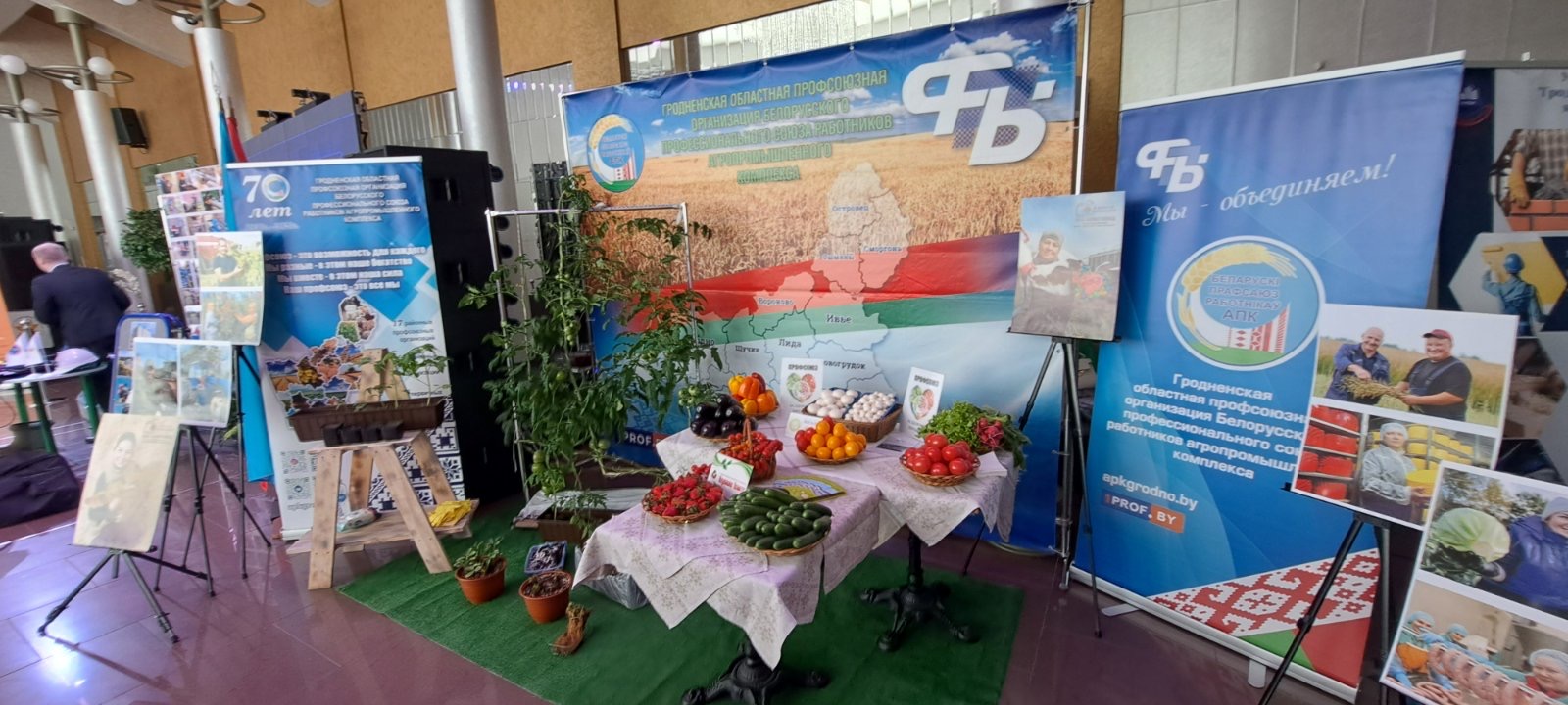 Проникнуться духом праздника помогала развернувшаяся в фойе интерактивная выставка профессий, которую подготовили профсоюзы. Например, у стенда Гродненской областной профсоюзной организации Белорусского профсоюза работников АПК можно было познакомится с работами участников фотоконкурса "В фокусе внимания...", который проводится областным комитетом в рамках празднования 120-летия профсоюзного движения Беларуси, а также ознакомится и попробовать различные виды плодоовощной продукции Гродненской овощной фабрики. Площадка Белхимпрофсоюза напоминала мини-лабораторию, а представители профсоюза работников образования и науки проводили мастер-класс по созданию бутоньерок «Цветок Великой Победы».