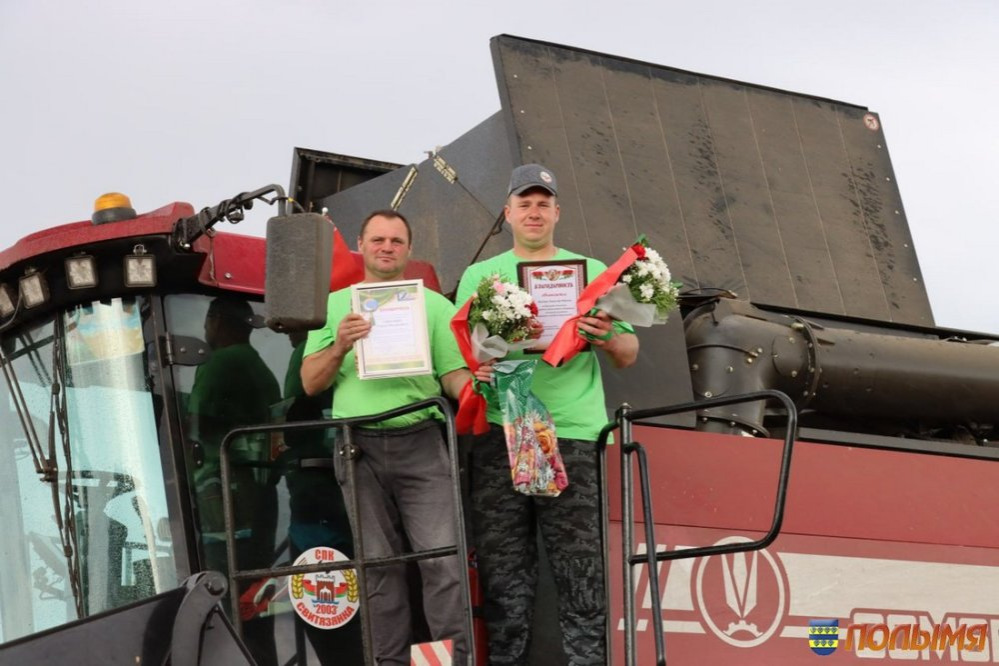 Андрей Валерьевич и Ирина Леонидовна искренне поздравили комбайнера, пожелали ему крепкого здоровья, высоких намолотов и вручили Благодарственное письмо, денежную премию и памятный подарок от райкома профсоюза АПК. Далее делегация направилась в СПК «Свитязянка-2003», где свою первую тысячу намолотили Сергей Сиротин и Александр Мелешко. Вместе на уборке урожая они работают уже второй сезон.
