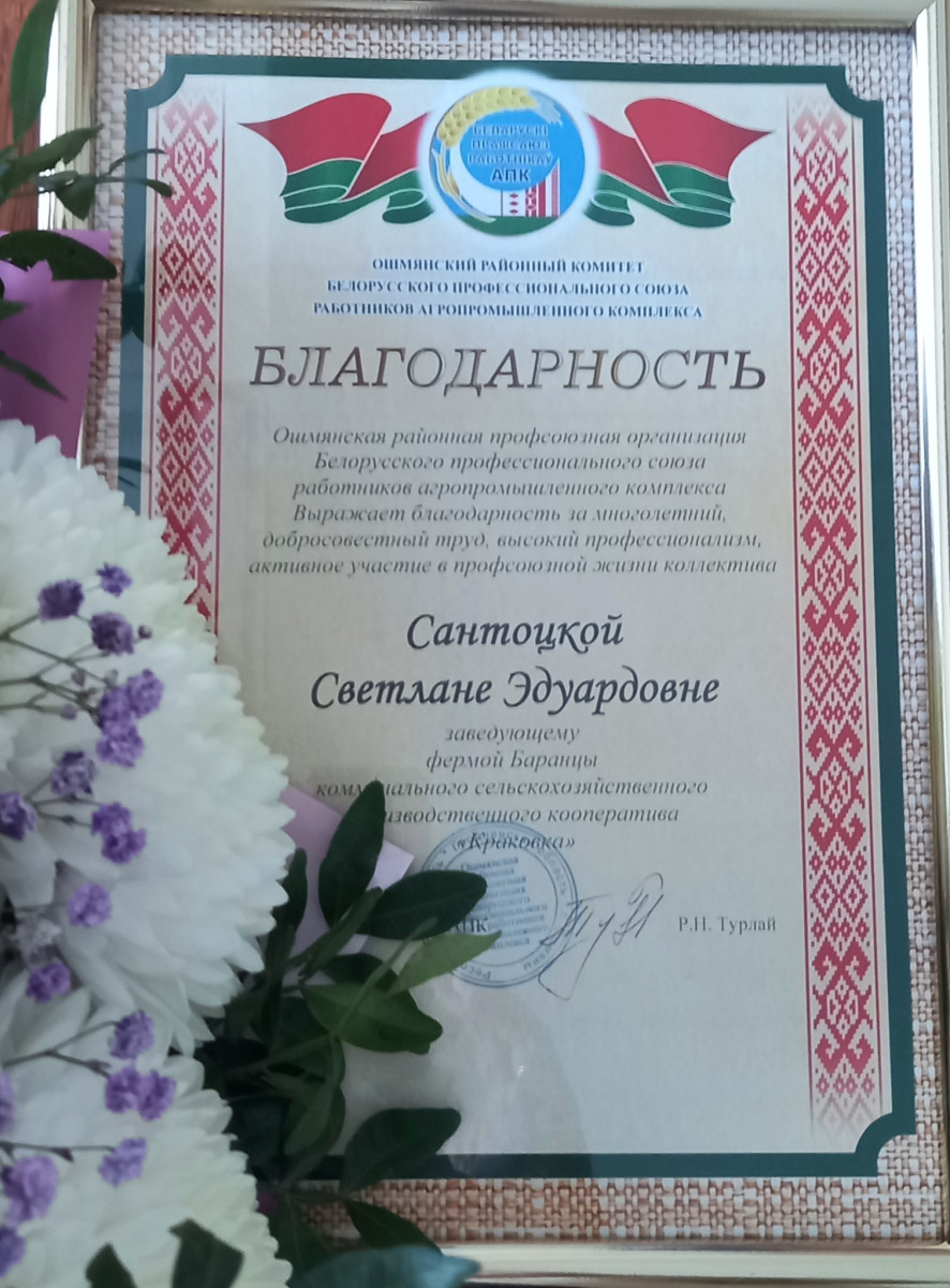 Благодарность Ошмянского районного профсоюзного комитета Белорусского профессионального союза работников агропромышленного комплекса награждена Сантоцкая Светлана Эдуардовна, заведующий фермой Баранцы коммунального сельскохозяйственного производственного кооператива «Краковка».