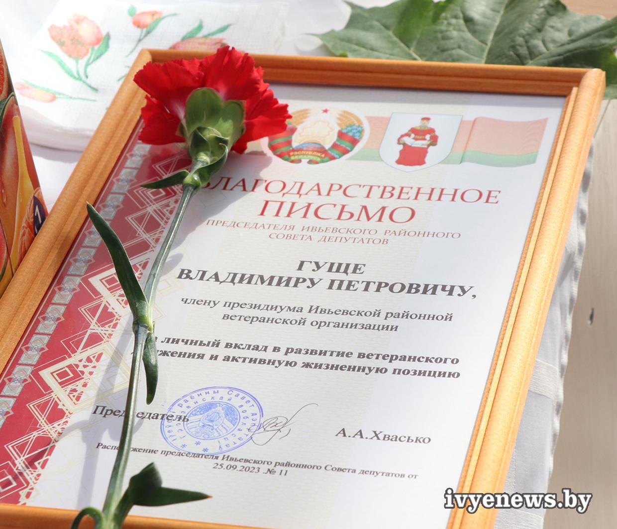 За личный вклад в развитие ветеранского движения и активную жизненную позицию Благодарственным письмом Ивьевского районного Совета депутатов был награжден Владимир Петрович Гуща, активный участник хора ветеранов труда Центра культуры и досуга г. Ивье, в совершенстве владеющий музыкальным инструментом, четкой и выразительной дирижерско-хоровой техникой, певческим голосом, член президиума районной ветеранской организации.