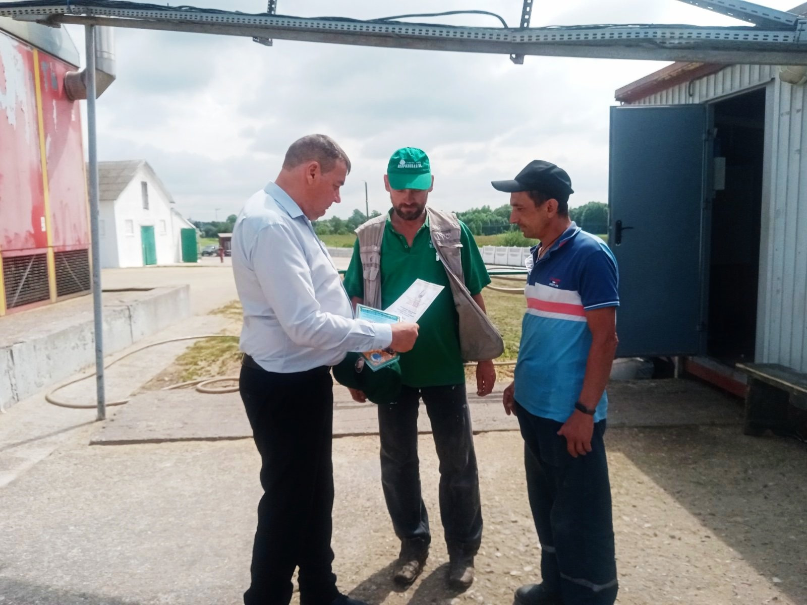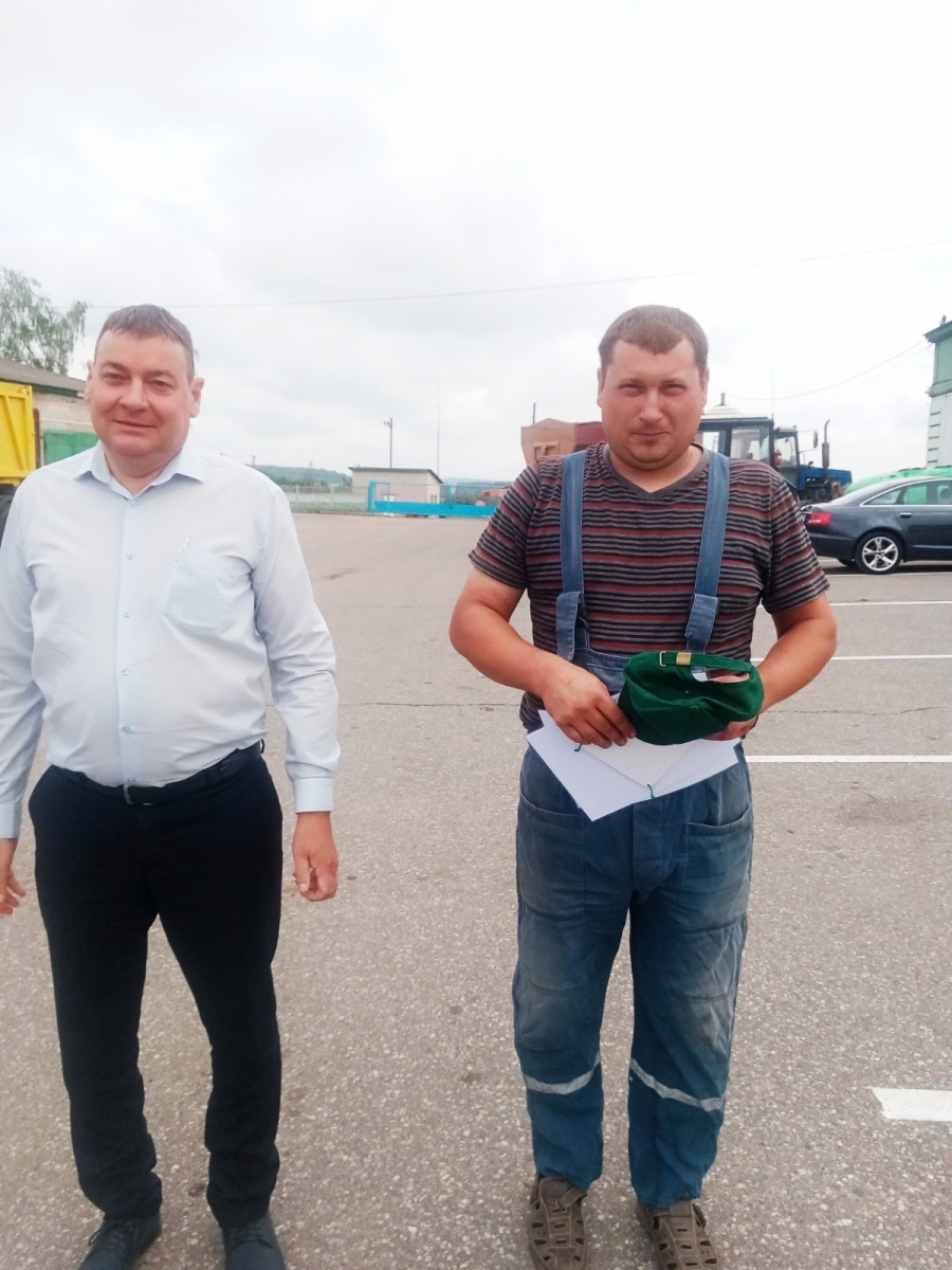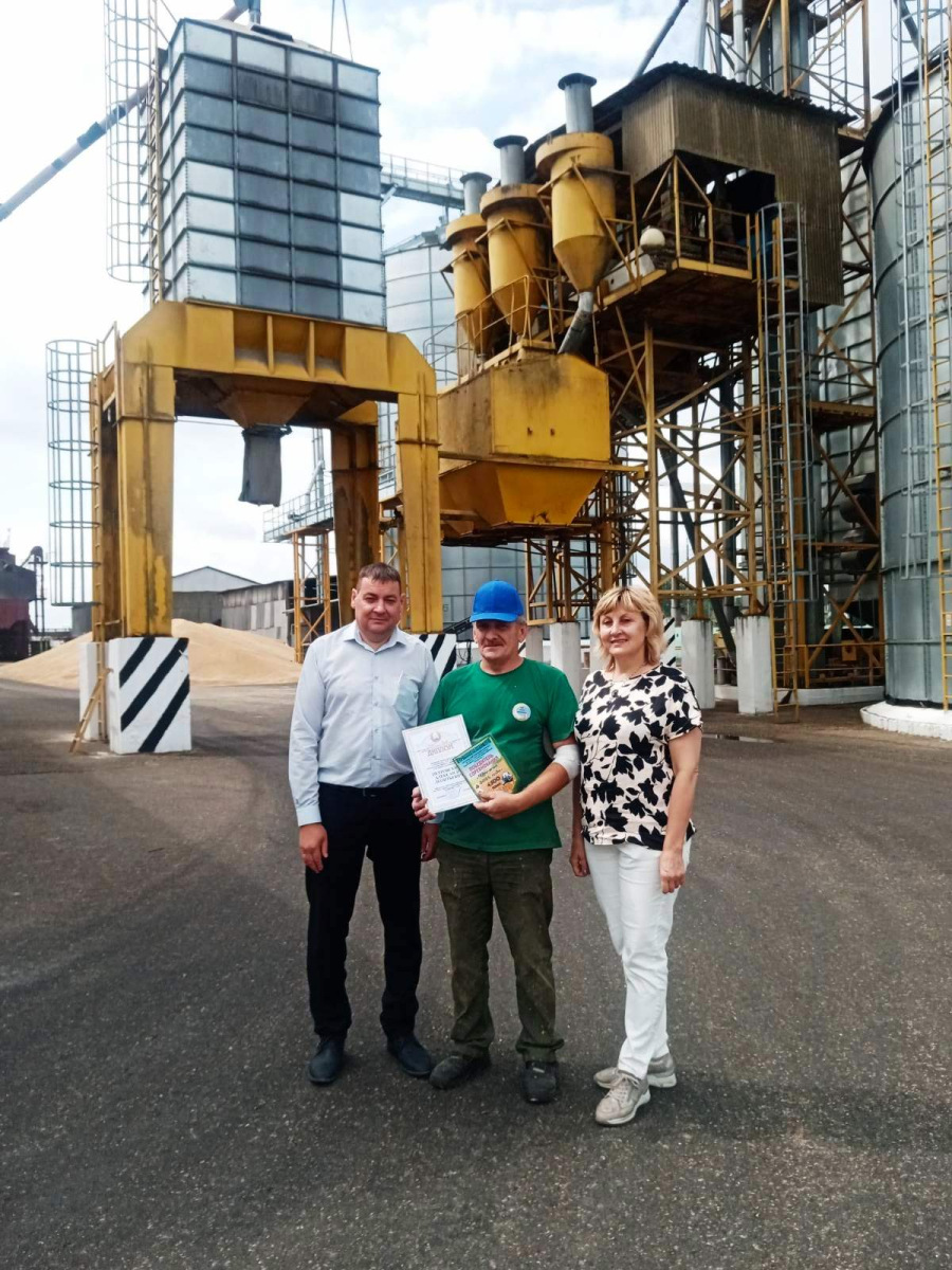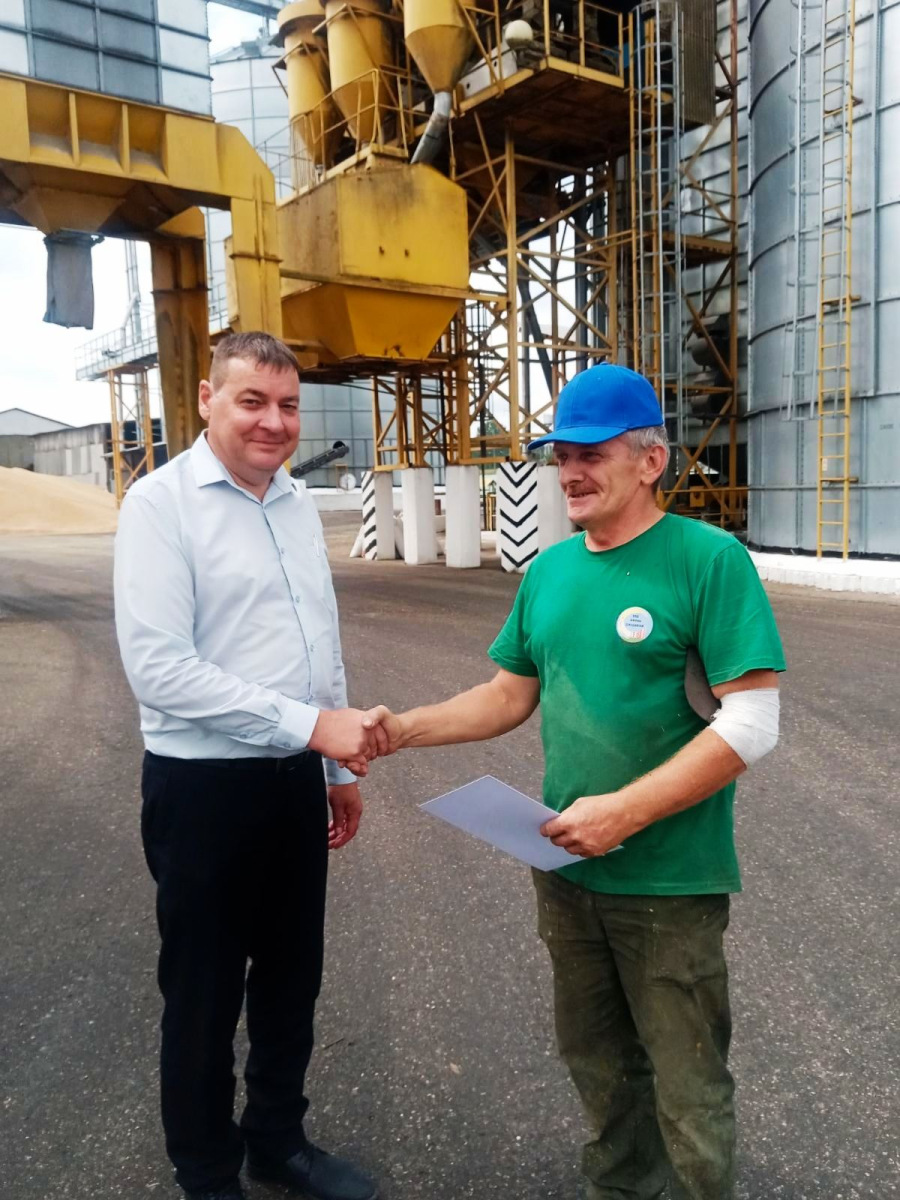 Председатель Гродненского райкома профсоюза работников АПК наградил дипломами, памятными сувенирами и подарками в денежном выражении Мосько Евгения, комбайнера, намолотившего в своей категории 1000 тонн, операторов сушильных установок, которые в своих номинациях переработали 6000 и 4500 тонн.