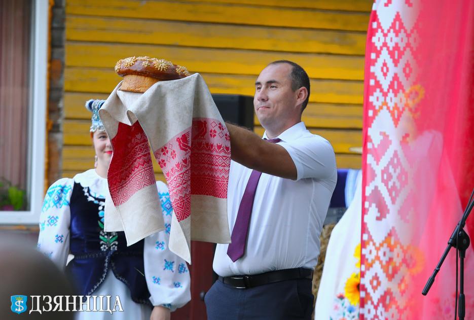 Торжественная церемония началась с вручения символического каравая. Девушка в национальном костюме преподнесла его директору Виктору Минько, который рассказал о результатах уборочной кампании 2025 года: