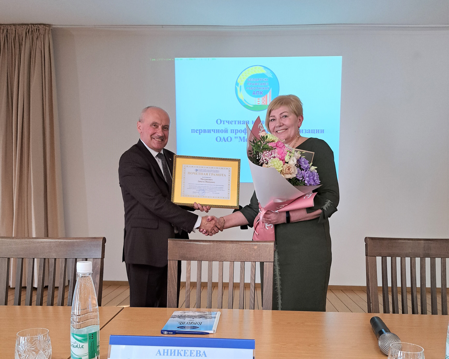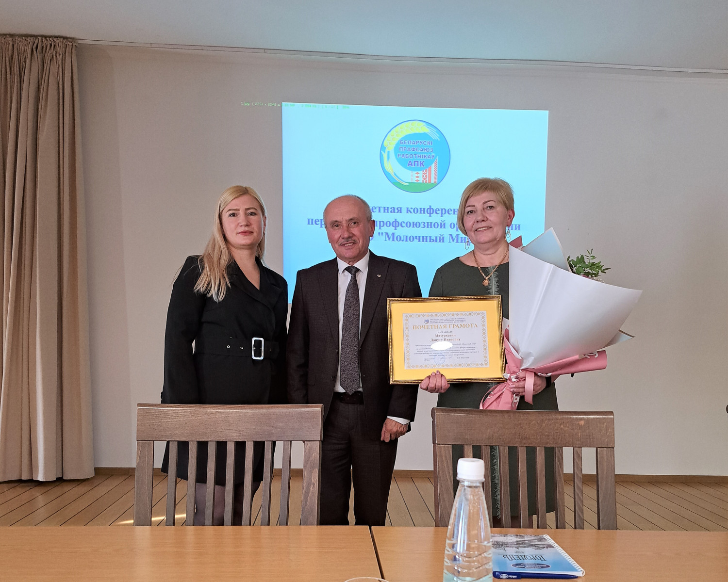 Участвующий в конференции председатель Гродненской областной профсоюзной организации Белорусского профсоюза работников АПК Ромуальд Юровский поблагодарил уже бывшего председателя ППО Дануту Мазуркевич за многолетний добросовестный труд, высокий профессионализм, личный вклад в развитие отрасли агропромышленного комплекса, а также активную работу по защите трудовых, социальтно-экономических и законных интересов членов отраслевого профсоюза и торжественно вручил ей Почетную грамоту Гродненского областного комитета Белорусского профсоюза работников АПК.