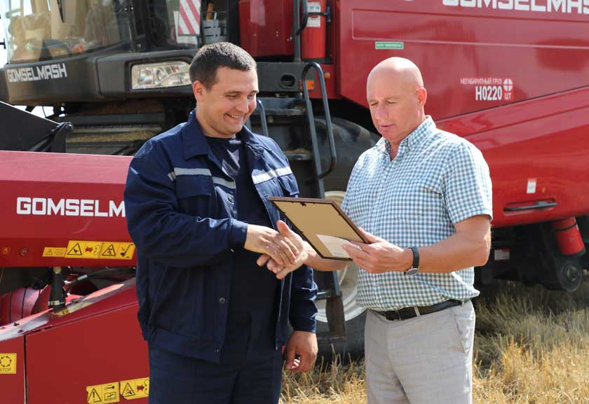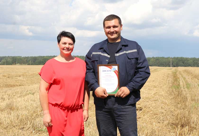 Каб павіншаваць яго і ўручыць заслужаную ўзнагароду, на поле, дзе працуе малады чалавек, прыехалі старшыні раённай арганізацыі Беларускага прафсаюза работнікаў аграпрамысловага комплексу Уладзімір Казак і пярвічнай прафсаюзнай арганізацыі КСУП “Хвінявічы” Вольга Максімава.