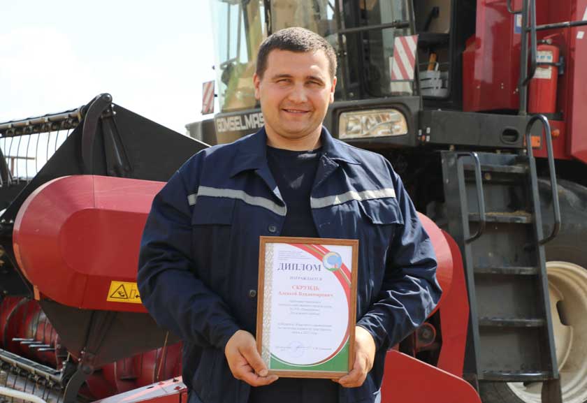 Аляксей Скрундзь працуе ў гаспадарцы толькі два гады, стараецца быць у ліку лепшых як на касьбе, так і на жніве. Ды і ўмовы для працы выдатныя: за час работы малады чалавек атрымаў новы трактар МТЗ-3322 з касілкай КМР-9, а таксама новы камбайн “Палессе”, на якім працуе другі сезон.