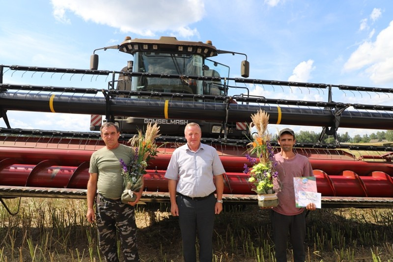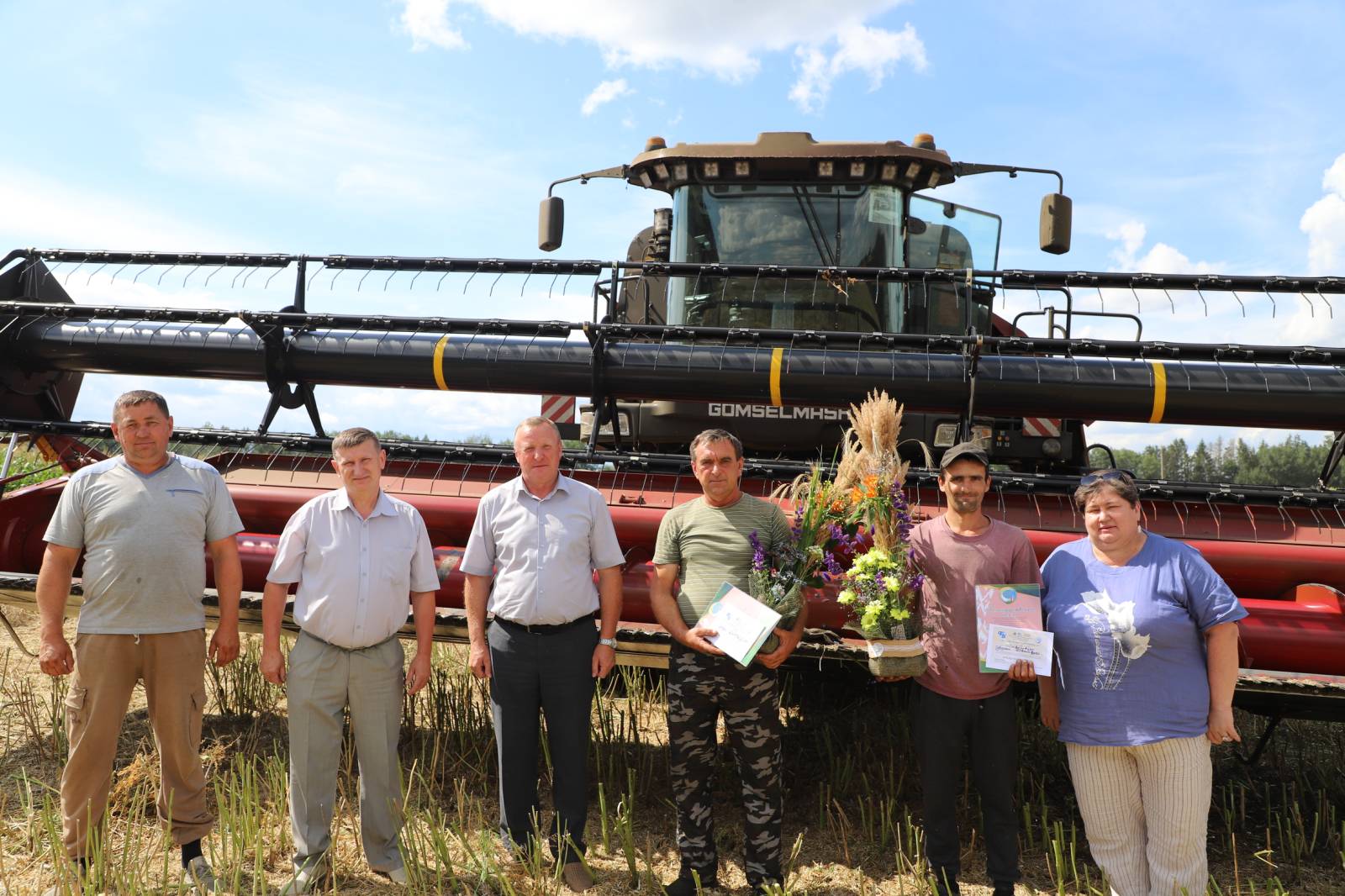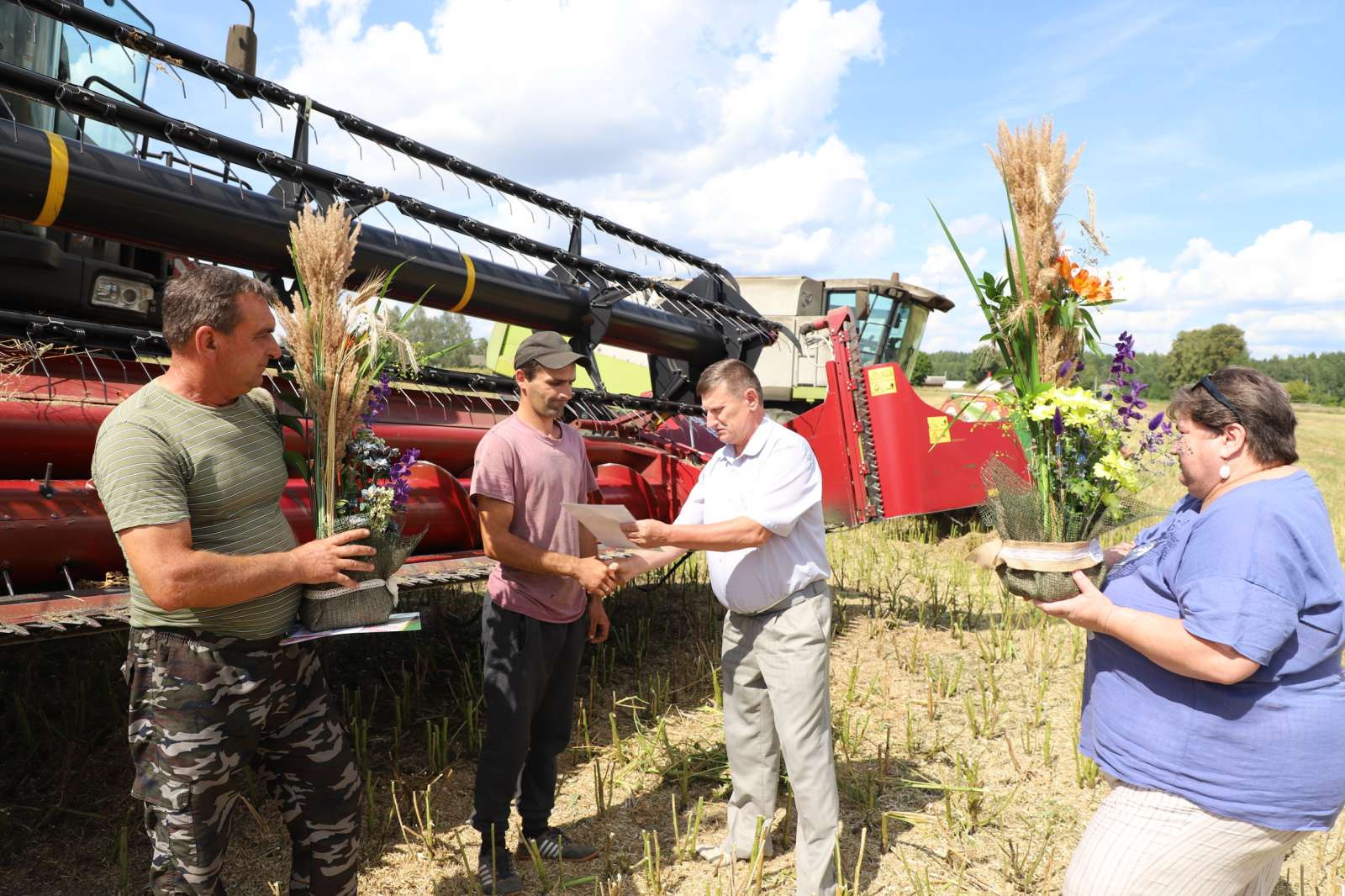 Традиционно прямо в поле, победителей соревнования по уборке зерновых и зернобобовых культур награждают и выражают слова благодарности : председатель Совета Депутатов Ошмянского района — Карпович Юрий Михайлович и председатель Ошмянской районной профсоюзной организации Белорусского профессионального союза работников АПК- Раиса Николаевна Турлай!