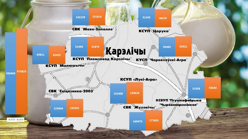 Вытворчасць малака ў сельгаспрадпрыемствах Карэліччыны за 2024 год (цэнтнераў)