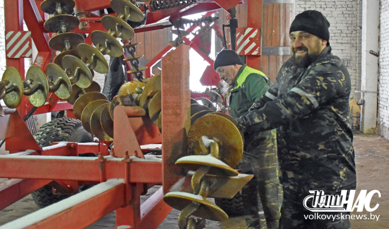 Заходим в мехмастерскую, где трудятся механизаторы Юрий Большаков и Бернард Богинский. Юрий Валерьевич подготавливает к новому сезону почвообрабатывающий агрегат — дисковый лущильник (ЛД-9) с шириной захвата 9 метров.