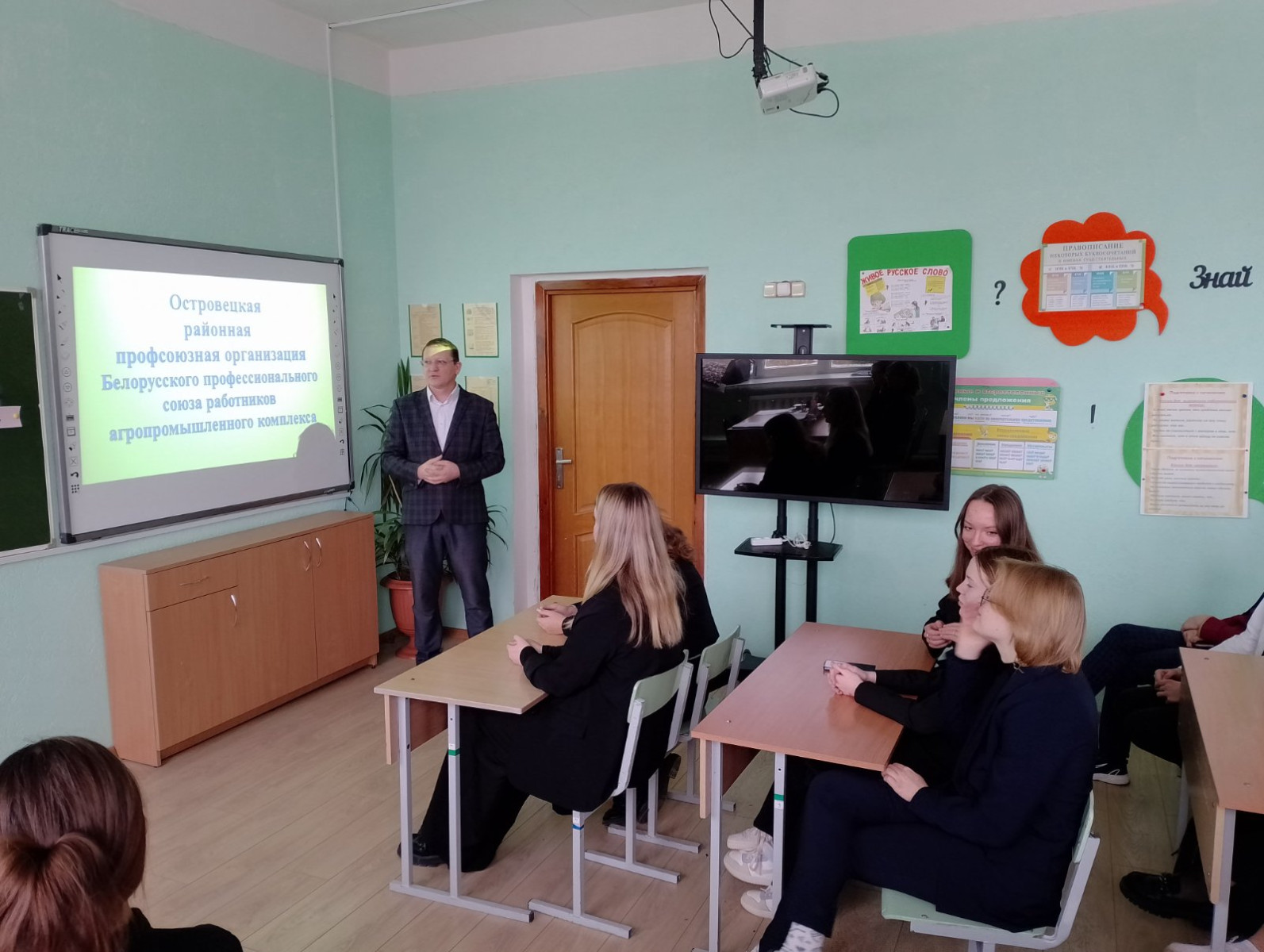 Во время мероприятия Юрий Адуло ознакомил старшеклассников с понятием «профсоюз», рассказал о сельском хозяйстве района и известных работниках сельского хозяйства Островецкого района.