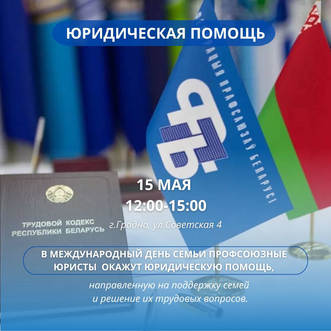 В Международный день семьи профсоюзные юристы всех областных организаций отраслевых профсоюзов окажут юридическую помощь, направленную на поддержку семей и решение их трудовых вопросов.