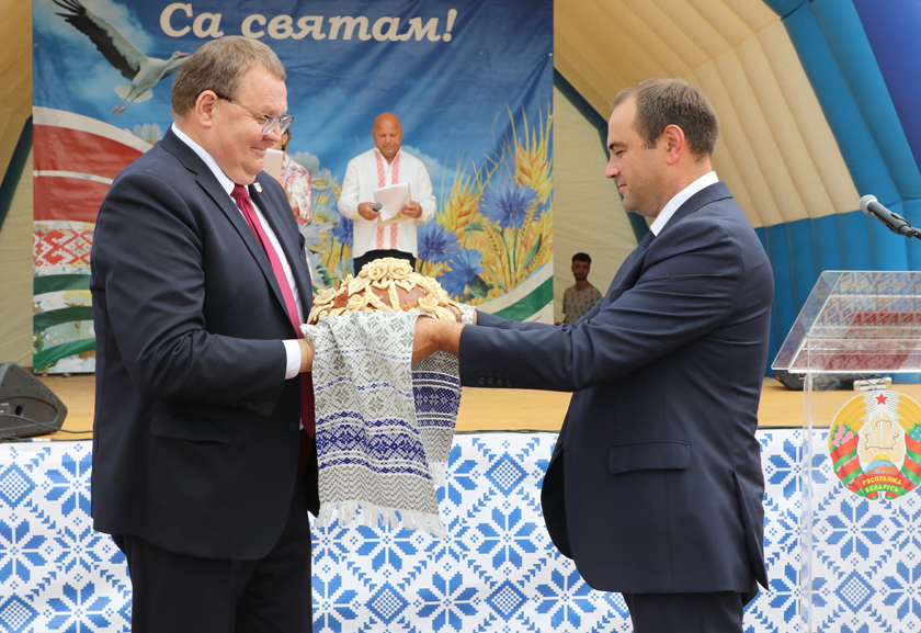 Ад імя ўсіх удзельнікаў сёлетняга жніва духмяны каравай кіраўніку раёна ўручыў першы намеснік старшыні райвыканкама – начальнік упраўлення сельскай гаспадаркі і харчавання Віталій Шулейка.