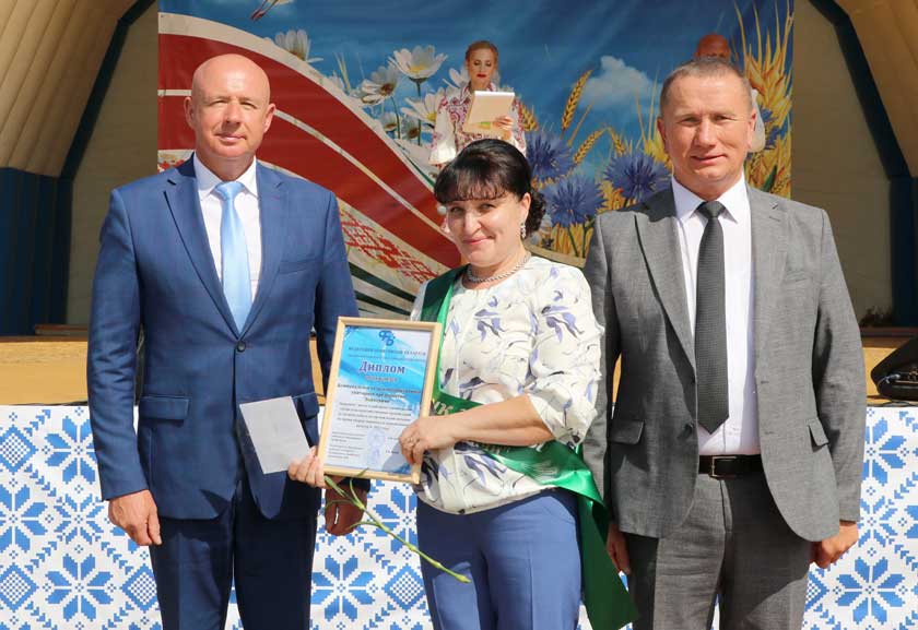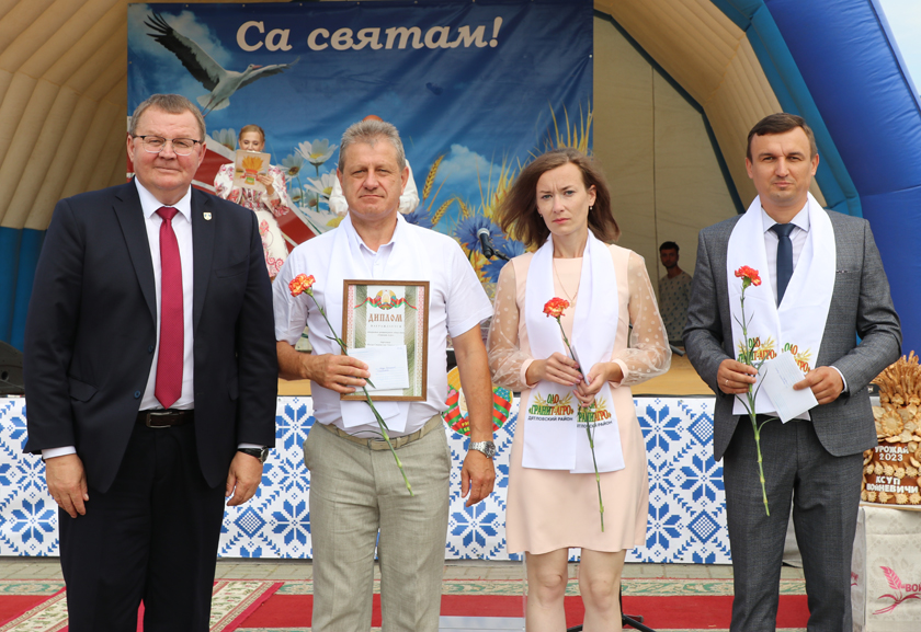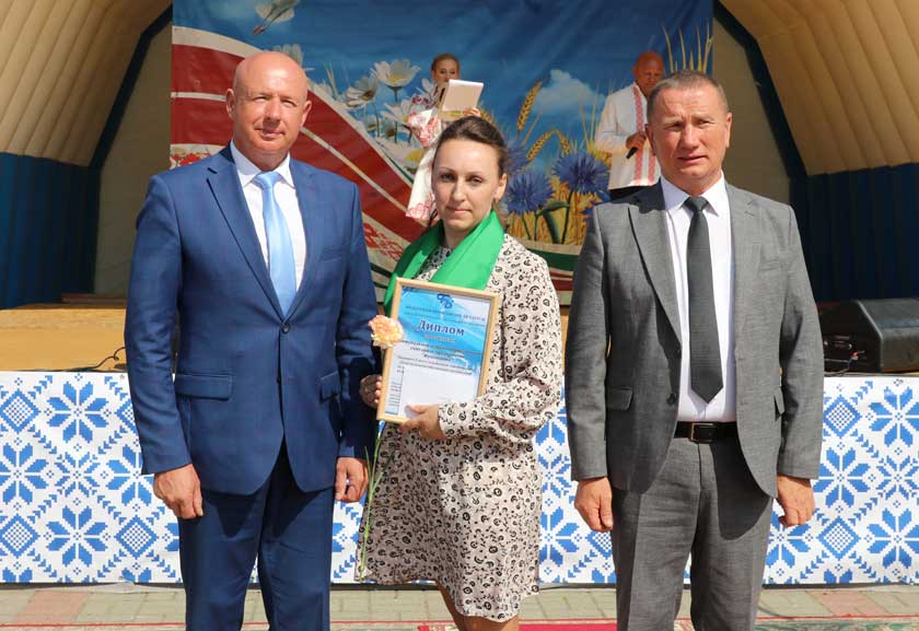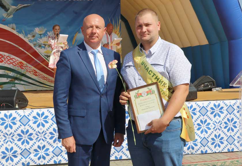 Павіншавалі прысутных са святам і адзначылі лепшых хлебаробаў прафсаюзнымі дыпломамі старшыня раённага аб’яднання прафсаюзаў Аляксандр Дубовік і старшыня раённай арганізацыі Беларускага прафсаюза работнікаў аграпрамысловага комплексу Уладзімір Казак.