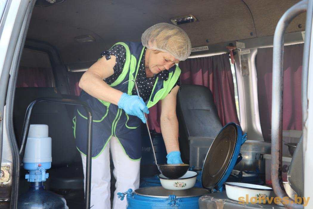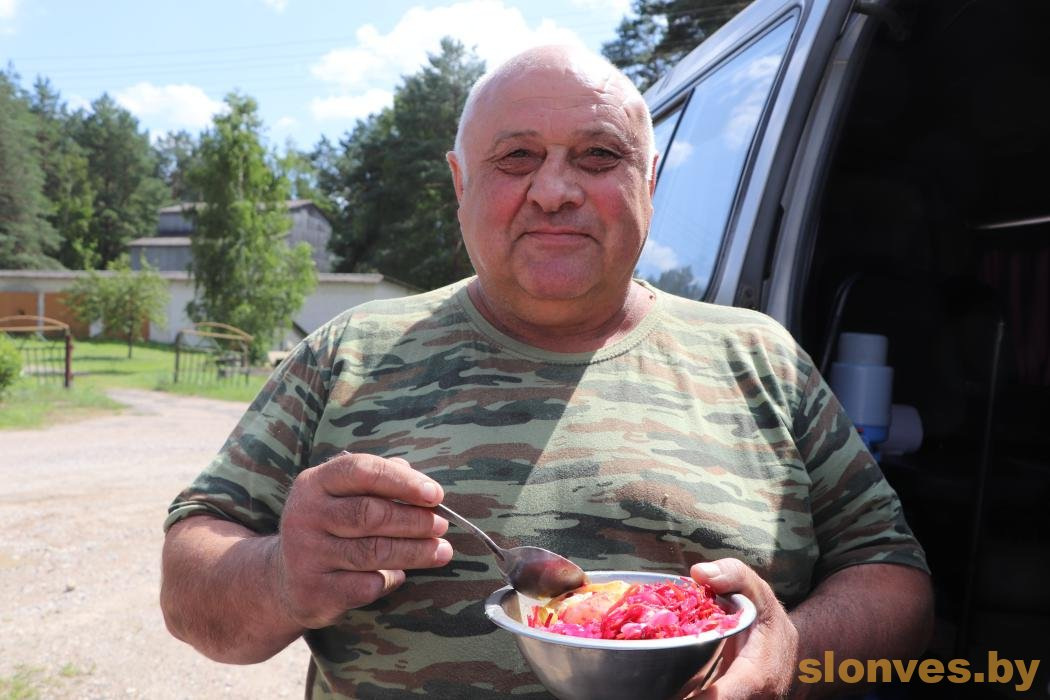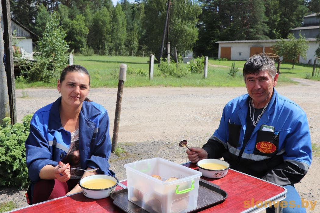 Больше всего нравится нашим едокам картофельное пюре – с отбивной, котлетой или рыбой. При этом каждый ценит разнообразие. Вчера в меню были щи, котлета и пшенная каша, позавчера – картофельное пюре, отбивная и помидоры. На ужин выдаем тушенку и каши производства Слонимского мясокомбината, булочку. И, конечно, воду». К слову, в прошлом году в особенно жаркие дни привозили для хлеборобов мороженое. Стоимость суточного питания – около 20 рублей. Все расходы на себя берет сельхозпредприятие. Одну из остановок «ГАЗель» сделала у зерносушильного комплекса «Павлово». Места за столиком стали занимать работники, задействованные на доработке зерна.