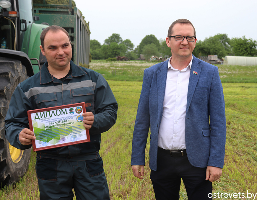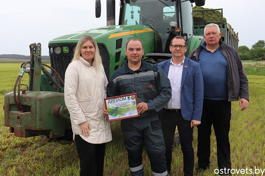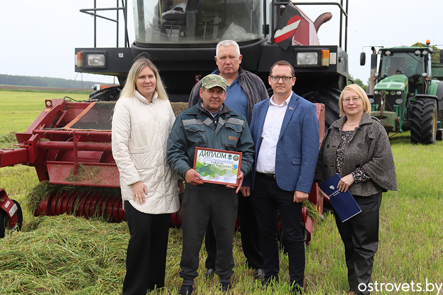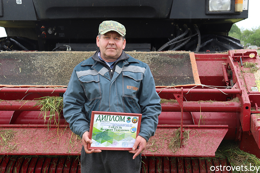 Заўважыўшы гасцей, Валянцін Гайдуль на некалькі хвілін спыніў кормаўборачны камбайн, каб атрымаць заслужаныя ўзнагароды – дыплом і грашовую прэмію.