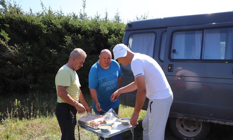 Накануне, на ужин была курица с гречкой и помидорчиком. К приходу хлеборобов у автобуса обычно уже готов стол – небольшой раскладной, но за ним удобно можно покушать. Хотя чаще всего комбайнеры и водители обедают стоя: после многих часов за рулем хочется ноги размять.