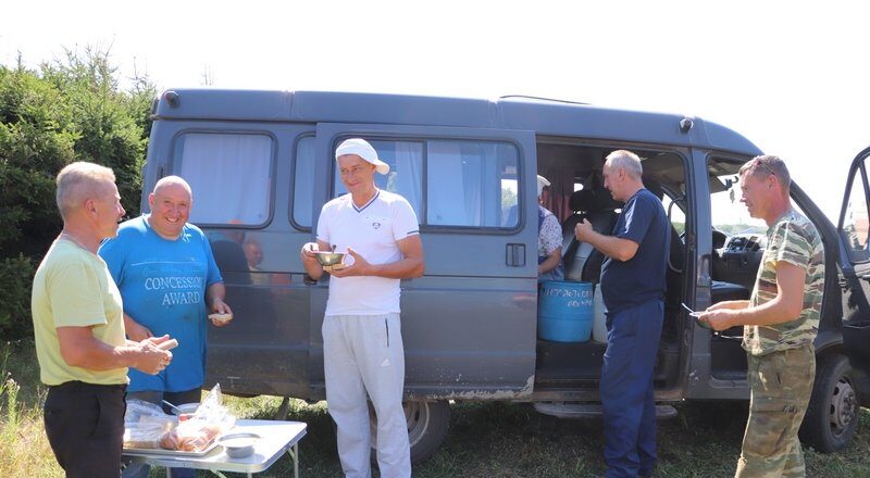 Прием пищи занял совсем немного времени, еще на пару минут труженики КСУП «Драпово» задержались в теньке – и опять за работу. Погода стоит как раз идеальная для жатвы. Нужно спешить.