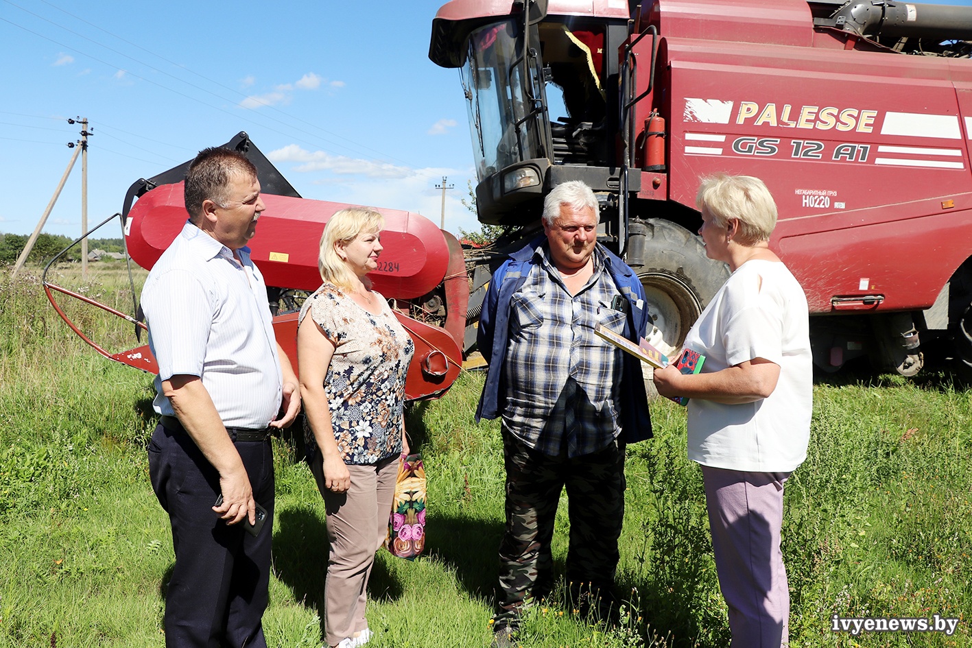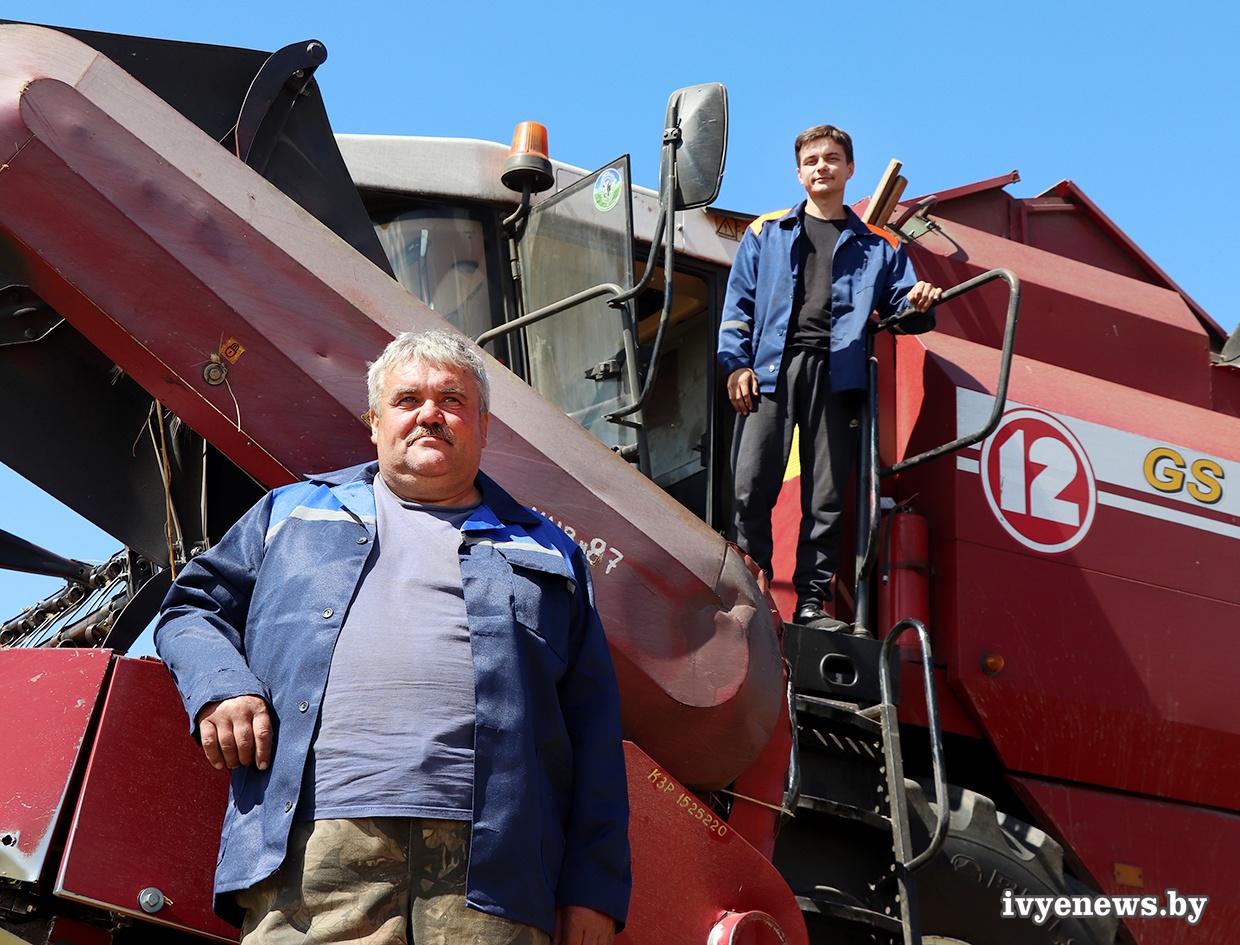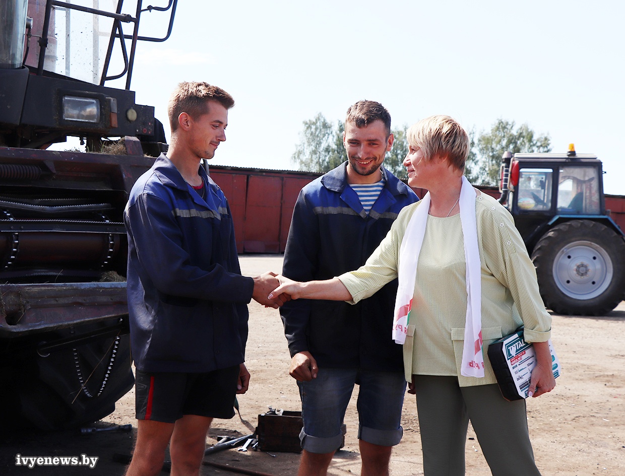 Все три семейных экипажа комбайнеров, принимающих участие в уборочной 2023 года в Ивьевском районе, поощрены ценными подарками ОО «Белая Русь», которые заместитель председателя Ивьевского райисполкома, председатель районной организации РОО «Белая Русь» Анжелика Цисар совместно с первым заместителем председателя райисполкома, начальником райсельхозпрода Светланой Филимон, председателем райкома профсоюза работников АПК Инессой Кулешо вручила комбайнерам прямо на их рабочих местах. В КСУП «Баума» таких экипажей двое: братья Евгений и Сергей Нехведовичи, отец и сын Войтех и Андрей Рынкевичи. Экипаж братьев Нехвядовичей - молодежный, родились ребята уже в 21-м веке, им 45 лет на двоих. Оба прошли действительную срочную службу в армии, так что флаг «ВДВ» на комбайне развевается по праву. Их родители также работали в сельском хозяйстве: отец водителем в КСУП «Субботники», мама – ветврачом.