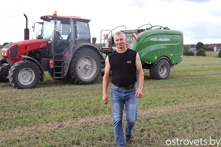 Сёлета Генадзь Змітровіч працуе на новым прэс-падборшчыку «Ф’южн». Мужчына закручвае ў стрэйч-плёнку падвяленую зялёную масу – гэтыя белыя шпулькі некаторыя называюць «чупа-чупсамі».